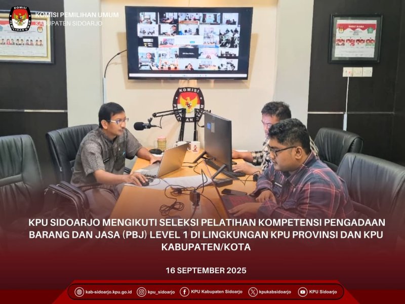 #TemanPemilih Komisi Pemilihan Umum Kabupaten Sidoarjo Mengikuti Seleksi Pelatihan Kompetensi Pengadaan Barang dan Jasa (PBJ) Level 1 di Lingkungan KPU Provinsi dan KPU Kabupaten/Kota. Sebanyak tiga pegawai KPU Sidoarjo mengikuti seleksi yang digelar KPU RI pada Selasa, 16 September 2025. Seleksi ini menjadi bagian dari upaya KPU untuk meningkatkan kualitas SDM di bidang pengadaan barang/jasa. Peserta yang lolos nantinya akan mengikuti pelatihan bersama LKPP pada November 2025. Seleksi ini diikuti oleh Azis Basuki, Khoerul Anam dan Edwin Prasetiawan.