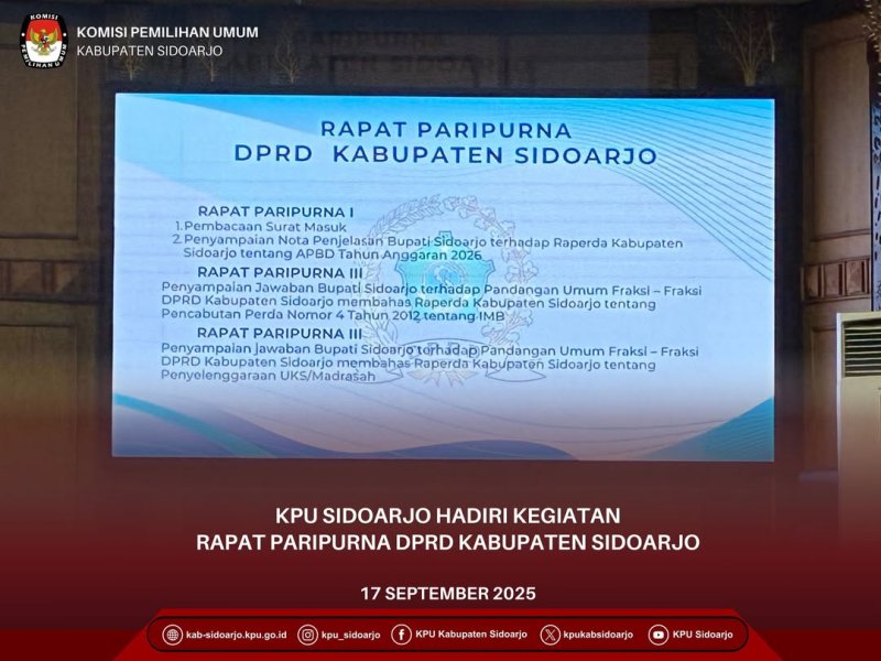 #TemanPemilih Komisi Pemilihan Umum Kabupaten Sidoarjo (KPU Sidoarjo) hadiri kegiatan Rapat Paripurna DPRD Kabupaten Sidoarjo pada hari Rabu, 17 September 2025 bertempat di Ruang Rapat Dewan Gedung DPRD Kabupaten Sidoarjo. Rapat paripurna kali ini dilaksanakan guna membahas Nota Penjelasan Bupati Sidoarjo terhadap Raperda Kabupaten Sidoarjo tentang APBD TA 2026. Hadir dalam kegiatan ini adalah anggota KPU Kabupaten Sidoarjo Divisi Sosdiklih, Parmas dan SDM M. Yasin.