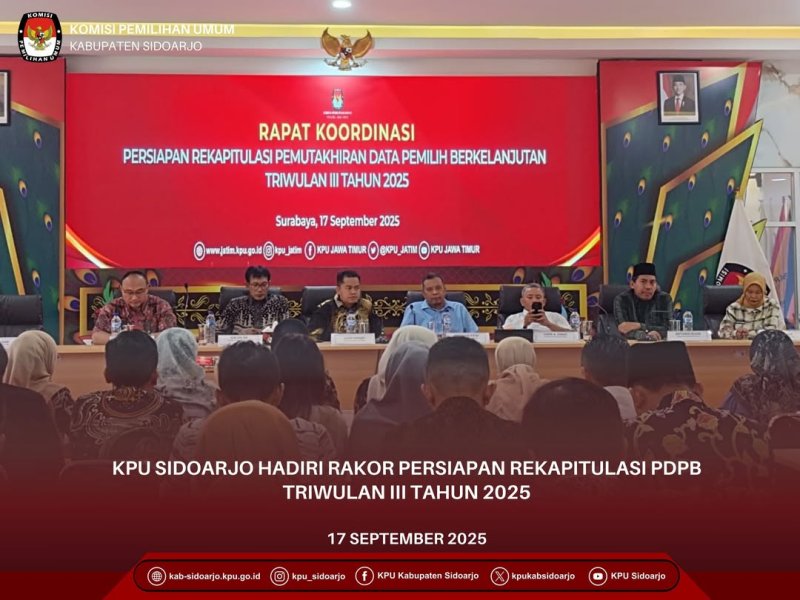 #TemanPemilih Komisi Pemilihan Umum Kabupaten Sidoarjo (KPU Sidoarjo) hadiri kegiatan Rapat Koordinasi Persiapan Rekapitulasi Pemutakhiran Data Pemilih Berkelanjutan (PDPB) Triwulan III Tahun 2025 yang dilaksanakan oleh Komisi Pemilihan Umum Kabupaten Sidoarjo Provinsi Jawa Timur (KPU Jatim) pada 17 September 2025 bertempat di ruang Aula Kantor KPU Jatim. Dalam kesempatan ini, Ketua KPU Kabupaten Sidoarjo Aang Kunaifi hadir secara langsung dan memberikan arahan penting mengenai komitmen KPU Sidoarjo dalam menjaga kualitas daftar pemilih. Ia menegaskan bahwa pemutakhiran data pemilih merupakan tugas berkelanjutan yang harus dilakukan dengan cermat, transparan, dan akuntabel demi menjamin hak pilih masyarakat. Melalui forum koordinasi ini, KPU Sidoarjo bersama KPU se-Jawa Timur menyatukan langkah dalam menyiapkan data pemilih yang lebih akurat dan berkelanjutan sebagai pijakan utama dalam Pemilu dan Pilkada mendatang. Hadir dalam kegiatan ini Anggota KPU Sidoarjo Divisi Perencanaan, Data, dan Informasi (Rendatin) KPU Sidoarjo, Muhammad Natsirudin Yahya, beserta operator Sidalih Yudha Nirbaya Bakti.