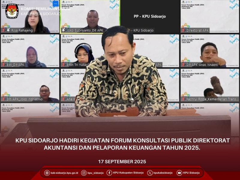 #TemanPemilih, Komisi Pemilihan Umum (KPU) Kabupaten Sidoarjo menghadiri Kegiatan Forum Konsultasi Publik Direktorat Akuntansi dan Pelaporan Keuangan Tahun 2025 yang diselenggarakan Direktorat Akuntansi dan Pelapoan Keuangan – Direktorat Jenderal Perbendaharaan, Kementerian Keuangan Republik Indonesia pada 17 September 2025 melalui media daring. Giat ini dilakukan sebagai upaya peningkatan kualitas layanan melalui pelibatan aktif public (Meaningful Participation) dalam penyusunan maupun penyempurnaan Standar Pelayanan. Dalam kesempatan tersebut juga diperkenalkan Layanan BIMA SAKTI (Bimbingan Online Sistem Akuntansi Keuangan Tingkat Instansi). Layanan BIMA SAKTI (Bimbingan Online Sistem Akuntansi Keuangan Tingkat Instansi) merupakan platform layanan daring yang disediakan oleh Direktorat Akuntansi dan Pelaporan Keuangan (Dit. APK) – Direktorat Jenderal Perbendaharaan, Kementerian Keuangan yang berfungsi sebagai media konsultasi dan bimbingan teknis online bagi satuan kerja/instansi pemerintah. Hadir dalam kegiatan ini Kepala Subbagian Keuangan, Umum, dan Logistik, Achmad Eko Budianto dan serta seluruh Staff Keuangan KPU Kabupaten Sidoarjo.