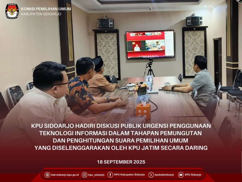 #TemanPemilih, KPU Kabupaten Sidoarjo menghadiri kegiatan Diskusi Publik Urgensi Penggunaan Teknologi Informasi Dalam Tahapan Pemungutan dan Penghitungan Suara Pemilihan Umum yang diselenggarakan oleh KPU Provinsi Jawa Timur secara daring pada hari Kamis, 18 September 2025. Hadir dalam kegiatan ini adalah Ketua dan Anggota KPU Provinsi Jawa Timur, Sekretaris KPU Provinsi Jawa Timur, Bawaslu Provinsi Jawa Timur, Bakesbangpol Provinsi Jawa Timur, Biro Pemerintahan Pemerintah Provinsi Jawa Timur, Ketua Partai Politik tingkat Provinsi Jawa Timur, Ketua dan Anggota yang membidangi Teknis Penyelenggaraan KPU Kabupaten/Kota se-Jawa Timur, serta Kasubbag dan Staf Teknis Penyelenggaraan Pemilu dan Hukum KPU Kabupaten/Kota se-Jawa Timur. Ketua KPU Provinsi Jawa Timur, Aang Kunaifi, dalam sambutannya menyampaikan bahwa kegiatan Diskusi Publik dengan tema Urgensi Penggunaan Teknologi Informasi Dalam Tahapan Pemungutan dan Penghitungan Suara Pemilihan Umum diselenggarakan sebagai salah satu bentuk dukungan terhadap program prioritas KPU RI yakni penguatan Sistem Informasi Pemilu. “diharapkan lewat diskusi ini dapat memberikan ragam masukan sehingga dapat menghasilkan rekomendasi atau usulan kepada KPU RI” tambah Aang. Hadir sebagai narasumber dalam kegiatan ini adalah Dr.rer.pol Mada Sukmajati, S.IP., M.PP. dan Karas Candra Guptakhan, S.Kom. serta bertindak sebagai moderator adalah Anggota KPU Provinsi Jawa Timur divisi Teknis Penyelenggaraan Chairul Umam.