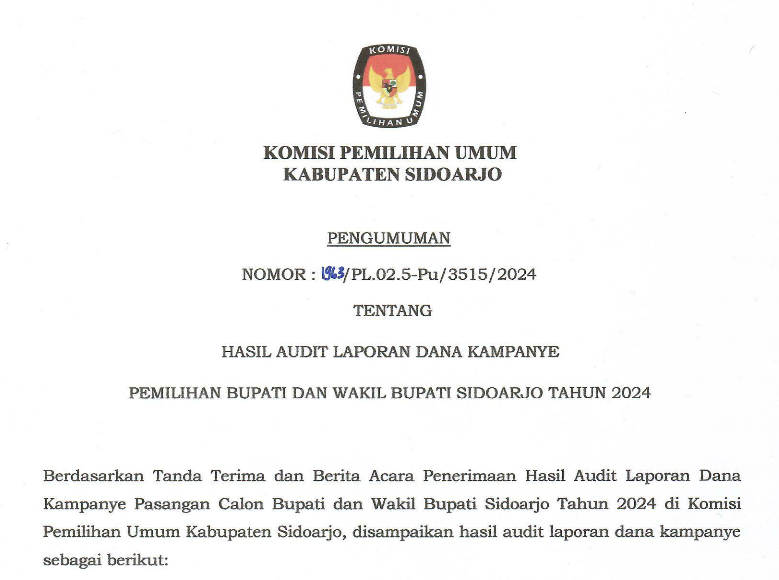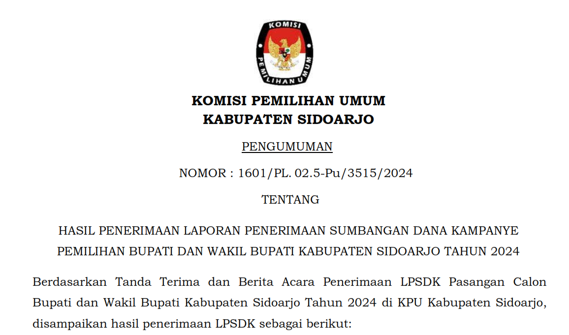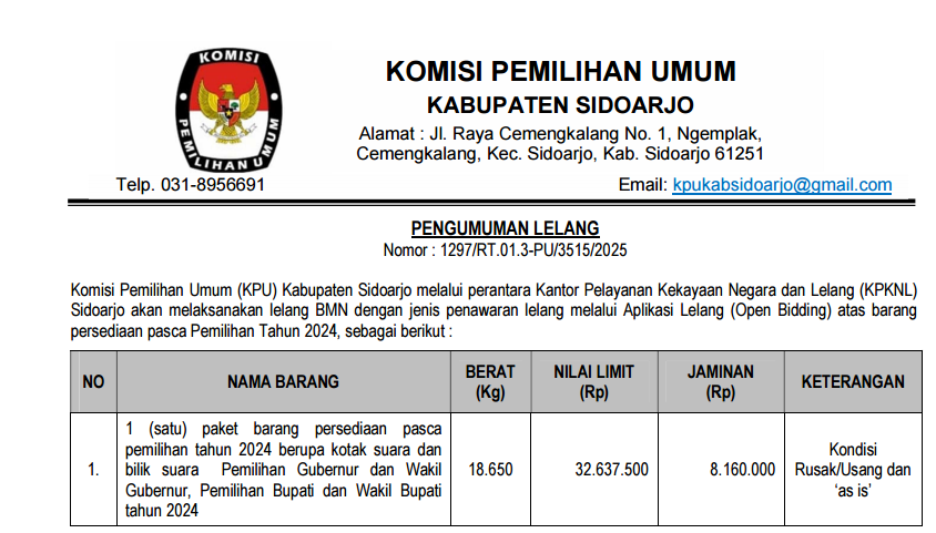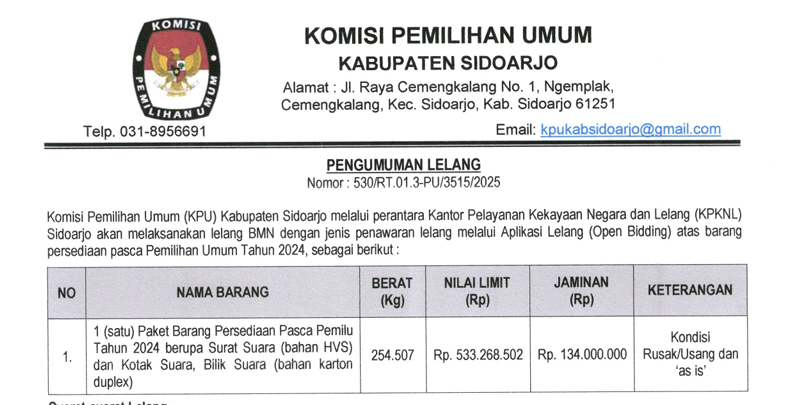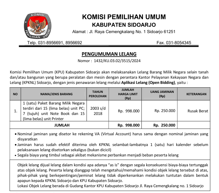 Komisi Pemilihan Umum (KPU) Kabupaten Sidoarjo akan melaksanakan Lelang Barang Milik Negara selain tanah dan/atau bangunan yang berupa peralatan dan mesin dengan perantara Kantor Pelayanan Kekayaan Negara dan Lelang (KPKNL) Sidoarjo, dengan jenis penawaran lelang melalui Aplikasi Lelang (Open Bidding), yaitu :