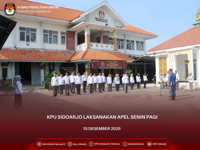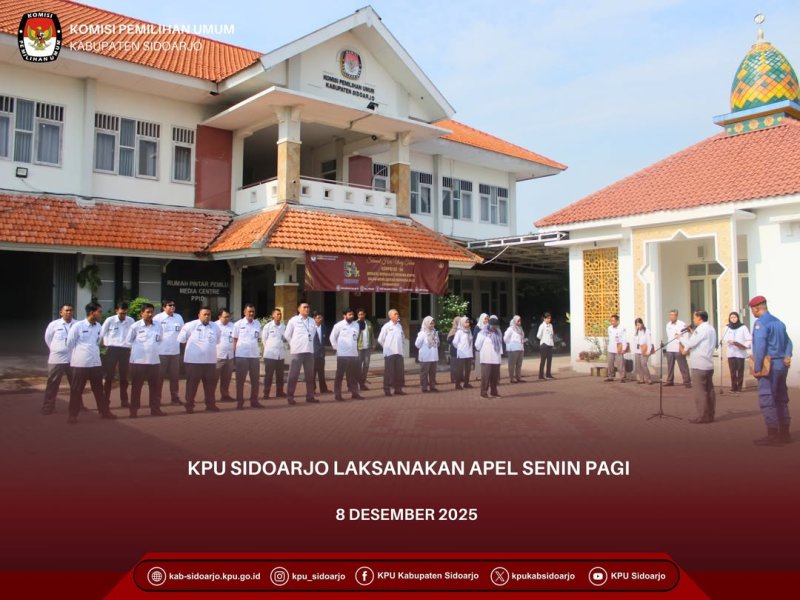 #TemanPemilih, Komisi Pemilihan Umum Kabupaten Sidoarjo (KPU Sidoarjo) melaksanakan Apel Pagi sebagai bentuk kedisiplinan serta dalam rangka melakukan koordinasi mingguan pada hari Senin (8/12/2025) di halaman kantor KPU Sidoarjo, Jln Raya Cemengkalang No 1 Kabupaten Sidoarjo.   Kasubbag Keuangan, Umum, dan Logistik KPU Sidoarjo, Achmad Eko Budianto, bertindak sebagai Pembina Apel. Pada kesempatan tersebut, Budi menyampaikan bahwa saat ini merupakan era digitalisasi. Karena itu, seluruh jajaran staf KPU Sidoarjo diimbau untuk memperkuat hubungan internal dan eksternal. Hubungan internal berfungsi sebagai sarana pengendalian diri, sedangkan hubungan eksternal bertujuan mengatur kerja sama dengan institusi lain.   Kegiatan apel ini dihadiri oleh Jajaran Kasubbag, staf, dan Mahasiswa/i magang di lingkungan KPU Sidoarjo   #KPUMelayani