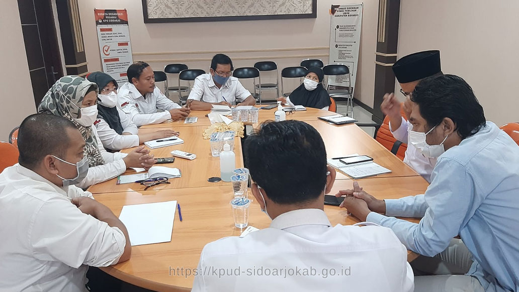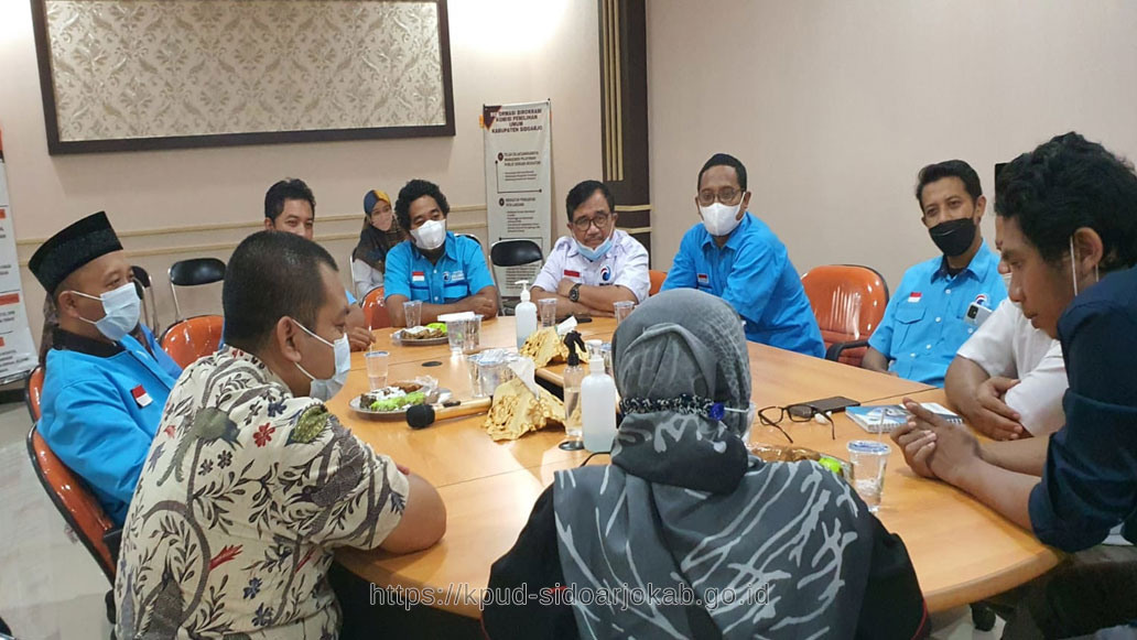 kpud-sidoarjokab.go.id-Kamis (30/12), KPU Kabupaten Sidoarjo mendapat kunjungan dari Partai Gelora Indonesia pada pukul 10.00 wib. Bertempat di Ruang Media Center Seluruh Komisioner dan Kasubbag KPU Kabupaten Sidoarjo menyambut tamu yang hadir. Beberapa perwakilan partai yang turut hadir berjumlah 7 orang, diantaranya adalah Ketua, Wakil Ketua, Sekretaris serta Wakil Sekretaris Partai Gelora Indonesia di tingkat Kabupaten Sidoarjo. Beberapa hal yang disampaikan dalam kunjungan ini antara lain pengenalan partai, serta pengurus partai. Selain itu, Ketua Partai Gelora Kabupaten Sidoarjo juga menyampaikan target yang ingin dicapai di Kabupaten Sidoarjo. Sebagai Calon Partai baru di Kabupaten Sidoarjo, Partai Gelora banyak menanyakan mengenai syarat-syarat yang harus dipenuhi untuk menjadi Partai Politik baru di Kabupaten Sidoarjo. Dalam kunjungan ini, Miftakul Rohmah, Komisioner KPU Divisi Teknis Penyelenggara menyampaikan agar Partai Gelora sudah mulai menyiapkan sejak dini terkait dengan persiapan pendaftaran dan verifikasi partai, diantaranya kantor partai, kepengurusannya, serta jumlah keanggotaannya harus sejumlah 1.000 atau 1/1000 dari jumlah penduduk di Kabupaten Sidoarjo, sambil terus menunggu perkembangan regulasi terbaru yang mengatur verifikasi partai. Disisi lain, KPU berharap agar hubungan antara penyelenggara pemilu dengan para peserta pemilu dapat saling bersinergi positif sesuai dengan aturan yang berlaku.”, tutup Iskak, Ketua KPU mengakhiri pertemuan.(naf)