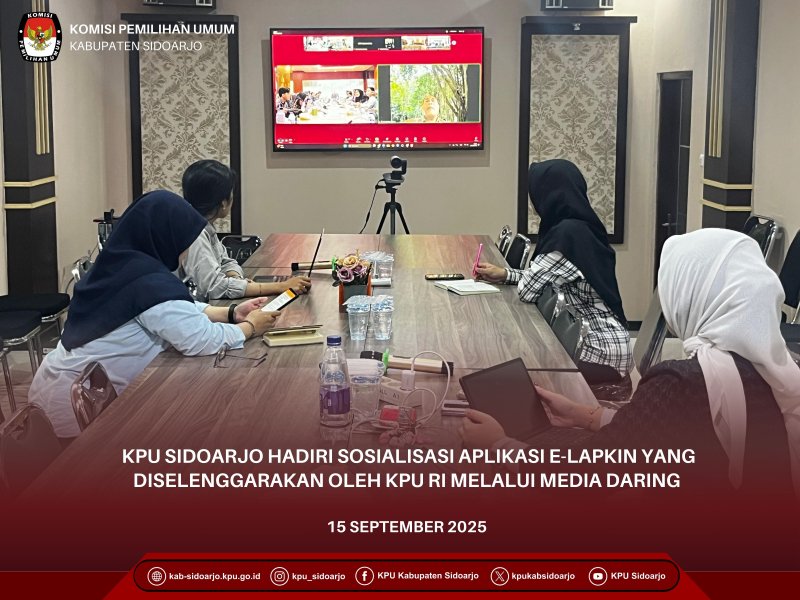 #TemanPemilih Komisi Pemilihan Umum Kabupaten Sidoarjo (KPU Sidoarjo) menghadiri kegiatan Sosialisasi Aplikasi E-Lapkin yang diselenggarakan oleh KPU RI pada hari Senin, 15 September 2025 secara daring melalui Zoom Meeting.
