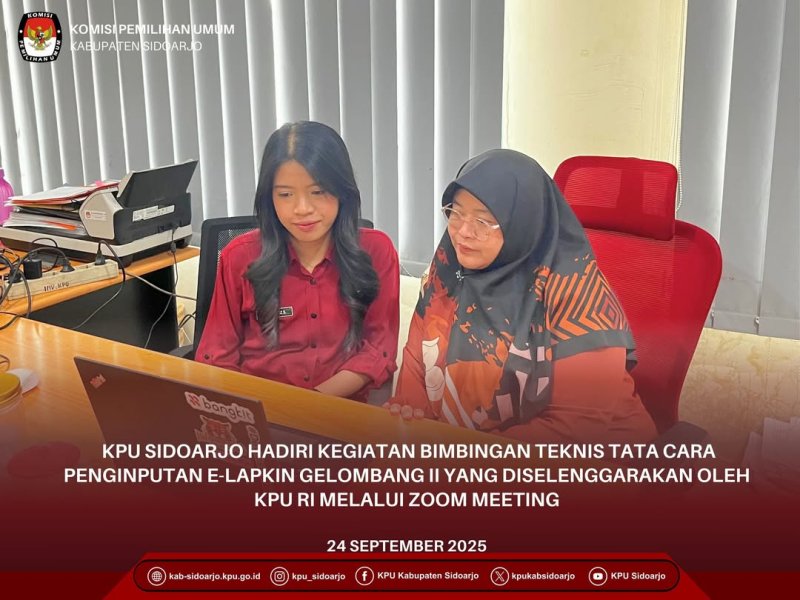 #TemanPemilih Komisi Pemilihan Umum Kabupaten Sidoarjo (KPU Sidoarjo) menghadiri kegiatan Bimbingan Teknis Tata Cara Penginputan E-Lapkin Gelombang II yang diselenggarakan oleh KPU RI pada hari Rabu, 24 September 2025 secara daring melalui Zoom Meeting.
