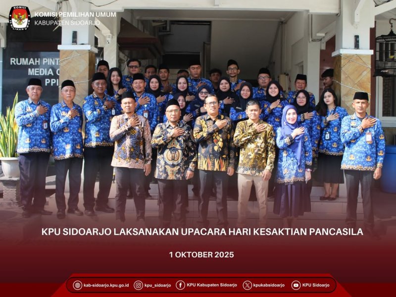 #TemanPemilih, Komisi Pemilihan Umum Kabupaten Sidoarjo melaksanakan Upacara Peringatan Hari Kesaktian Pancasila pada Rabu, 1 Oktober 2025. Kegiatan ini digelar di halaman Kantor KPU Sidoarjo dan diikuti oleh Anggota beserta jajaran Sekretariat KPU Sidoarjo.