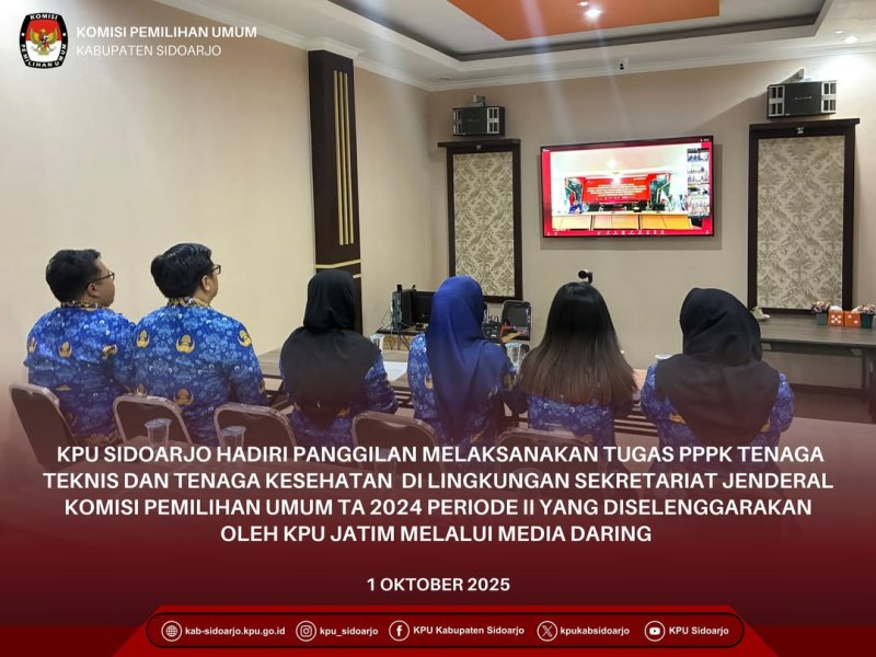 #TemanPemilih, Komisi Pemilihan Umum (KPU) Kabupaten Sidoarjo hadiri kegiatan Panggilan Melaksanakan Tugas Pegawai Pemerintah Dengan Perjanjian Kerja (PPPK) Tenaga Teknis dan Tenaga Kesehatan di Lingkungan Sekretariat Jenderal Komisi Pemilihan Umum Tahun Anggaran 2024 Periode II yang diselenggarakan oleh KPU Provinsi Jawa Timur pada Rabu 1 Oktober 2025 melalui media daring.