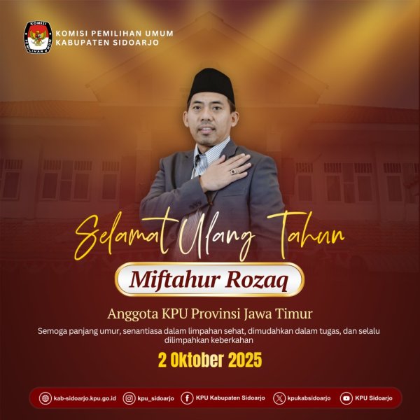 Segenap Keluarga Besar Komisi Pemilihan Umum Kabupaten Sidoarjo mengucapkan Selamat Ulang Tahun untuk Bapak Miftahur Rozaq