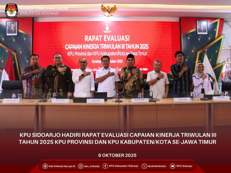 #TemanPemilih, Dalam rangka evaluasi capaian kinerja Triwulan III Tahun 2025, Komisi Pemilihan Umum Provinsi Jawa Timur (KPU Jatim) menggelar rapat bersama Ketua dan Sekretaris KPU dari 38 Kabupaten/Kota, termasuk KPU Kabupaten Sidoarjo. Kegiatan ini berlangsung pada Senin, 6 Oktober 2025, bertempat di Aula Lantai 2 Kantor KPU Jatim, Jalan Raya Tenggilis No. 1–3 Surabaya.