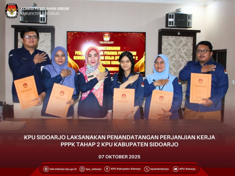 #TemanPemilih, Komisi Pemilihan Umum Kabupaten Sidoarjo (KPU Sidoarjo) melaksanakan kegiatan Penandatanganan Perjanjian Kerja Pegawai Pemerintah dengan Perjanjian Kerja (PPPK) Kabupaten Sidoarjo yang bertempat di Ruang Media Center KPU Sidoarjo Jl Raya Cemengkalang no 1 Sidoarjo pada 7 Oktober 2025.
