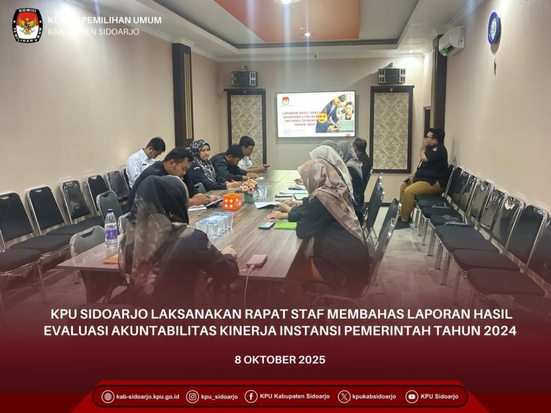 #TemanPemilih, Komisi Pemilihan Umum Kabupaten Sidoarjo (KPU Sidoarjo) melaksanakan kegiatan rapat staf membahas laporan hasil evaluasi akuntabilitas kinerja instansi pemerintah tahun 2024 yang diselenggarakan di Ruang Media Center KPU Sidoarjo pada Rabu, 08 Oktober 2025.