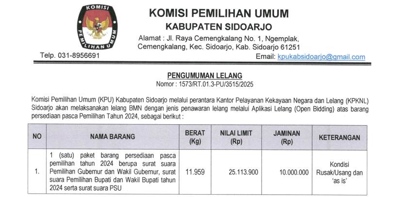 Komisi Pemilihan Umum Kabupaten Sidoarjo melalui perantara Kantor Pelayanan Kekayaan Negara dan Lelang (KPKNL) Sidoarjo akan melaksanakan lelang BMN dengan jenis penawaran lelang melalui Aplikasi Lelang (Open Bidding) atas barang persediaan pasca Pemilihan Gubernur dan Wakil Gubernur serta Bupati dan Wakil Bupati Tahun 2024 sebagai berikut
