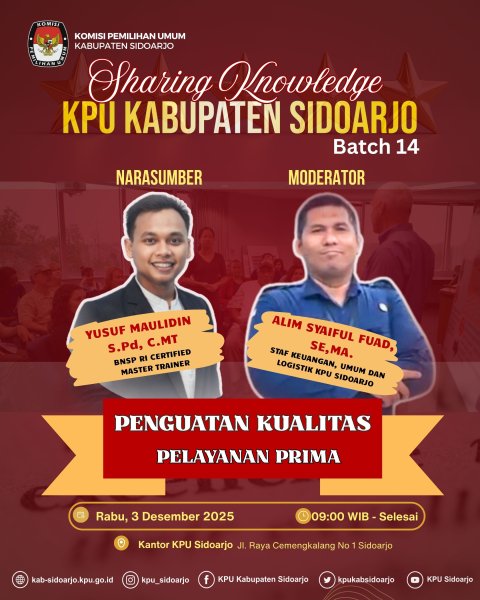 Komisi Pemilihan Umum (KPU) Kabupaten Sidoarjo akan menyelenggarakan Sharing Knowledge KPU Sidoarjo Batch 14 dengan mengangkat tema Penguatan Kualitas Pelayanan Prima