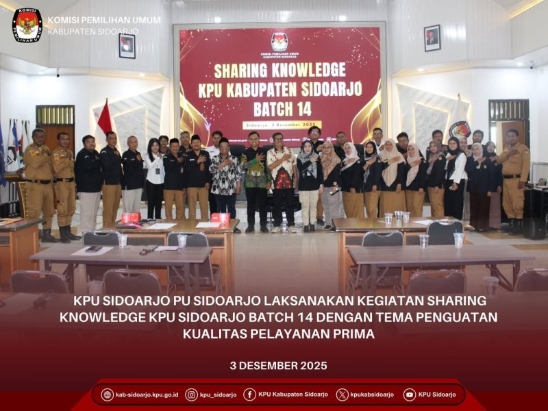 #TemanPemilih, Komisi Pemilihan Umum (KPU) Kabupaten Sidoarjo kembali melaksanakan kegiatan Sharing Knowledge KPU Sidoarjo Batch 14 dengan tema Penguatan Kualitas Pelayanan Prima. Kegiatan ini digelar pada Rabu, 3 Desember 2025 bertempat di Aula Lt. 2 KPU Kabupaten Sidoarjo sebagai bagian dari komitmen berkelanjutan untuk meningkatkan kapasitas dan kualitas pelayanan para pegawai di lingkungan KPU Sidoarjo.