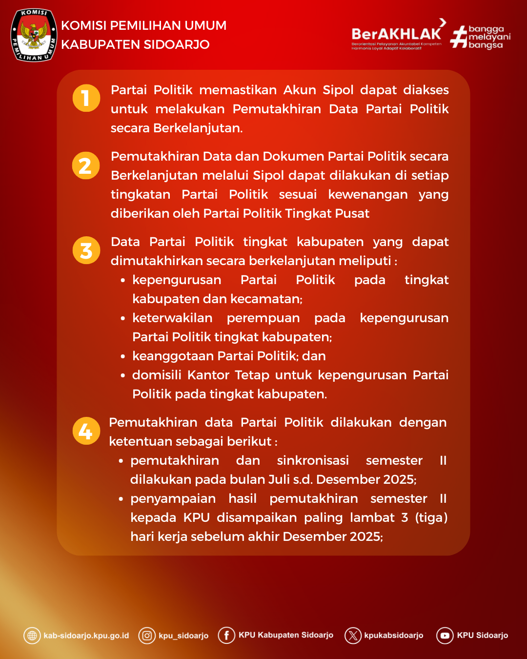KPU Kabupaten Sidoarjo menginformasikan bahwa Partai Politik dapat melakukan Pemutakhiran Data Partai Politik secara Berkelanjutan Tahun 2025