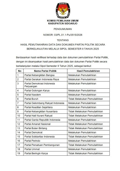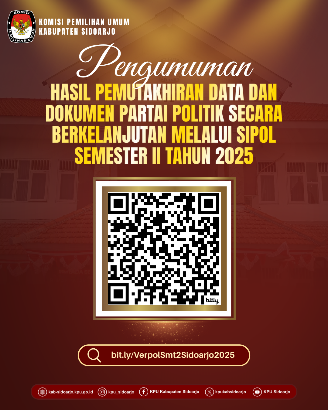 #TemanPemilih, berikut adalah Hasil Pemutakhiran Data dan Dokumen Partai Politik Secara Berkelanjutan Melalui SIPOL Semester II Tahun 2025 di wilayah Kabupaten Sidoarjo.
