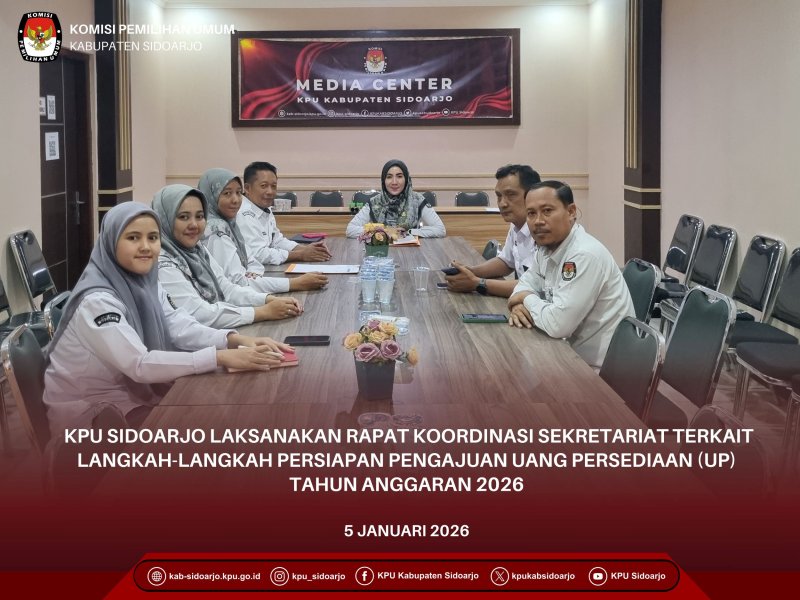 #TemanPemilih, Komisi Pemilihan Umum Kabupaten Sidoarjo (KPU Sidoarjo) melaksanakan Rapat Koordinasi Sekretariat terkait Langkah-Langkah Persiapan Pengajuan Uang Persediaan (UP) Tahun Anggaran 2026 pada Senin, 5 Januari 2025. Kegiatan ini berlangsung di Ruang Media Center Kantor KPU Kabupaten Sidoarjo.