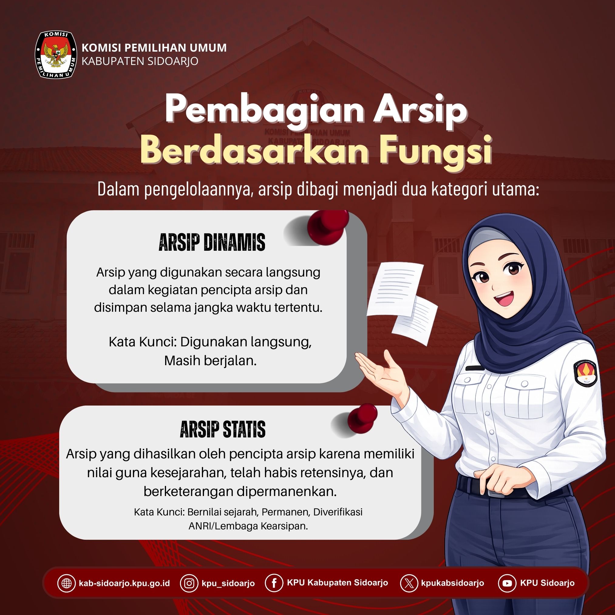 Berdasarkan fungsinya, arsip dibagi menjadi dua. Arsip dinamis adalah arsip yang masih digunakan dalam aktivitas kerja, sedangkan arsip statis merupakan arsip bernilai sejarah yang disimpan secara permanen.