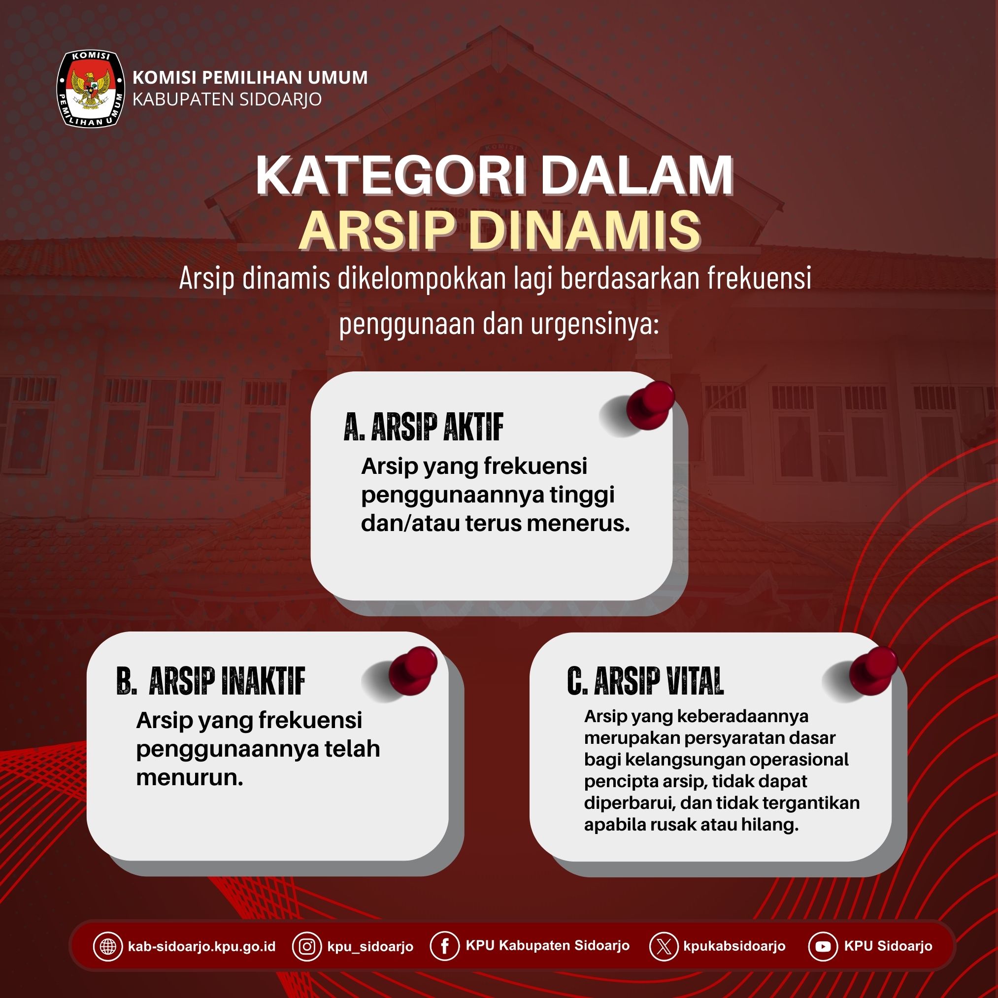 Arsip dinamis terdiri dari arsip aktif yang sering digunakan, arsip inaktif yang penggunaannya mulai menurun, serta arsip vital yang sangat menentukan kelangsungan organisasi dan tidak tergantikan apabila hilang.