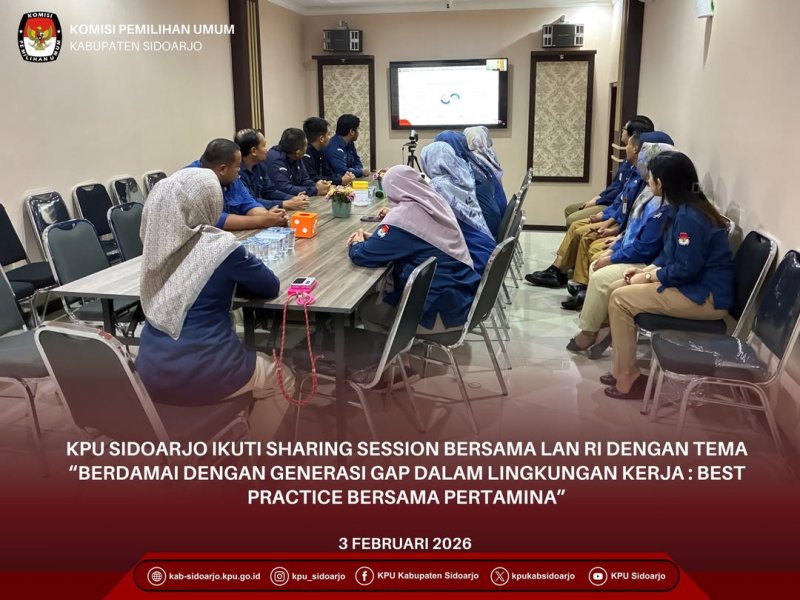 Komisi Pemilihan Umum Kabupaten Sidoarjo (KPU Sidoarjo) mengikut Sharing Session “Berdamai dengan GAP Generation dalam Lingkungan Kerja: Best Practice Bersama Pertamina”, Selasa, 3 Februari 2026 di LAN RI bertempat di R. Media Center KPU Sidoarjo, kita belajar bahwa gap usia dapat memengaruhi kolaborasi dan inovasi jika tidak disikapi dengan tepat.