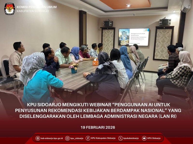 #TemanPemilih Komisi Pemilihan Umum Kabupaten Sidoarjo (KPU Sidoarjo) mengikuti Webinar “Penggunaan AI untuk Penyusunan Rekomendasi Kebijakan Berdampak Nasional” yang diselenggarakan oleh Lembaga Administrasi Negara (LAN RI) bekerja sama dengan BINAR Academy dan Microsoft. Kegiatan ini merupakan bagian dari inisiatif penguatan kompetensi ASN dalam pemanfaatan kecerdasan buatan untuk mendukung perumusan kebijakan publik. pada Kamis, 19 Februari 2026, melalui media daring.