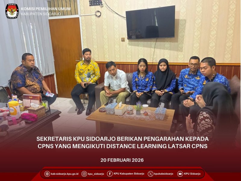 Sekretaris Komisi Pemilihan Umum Kabupaten Sidoarjo (KPU Sidoarjo) memberikan pengarahan kepada Calon Pegawai Negeri Sipil (CPNS) yang mengikuti distance learning Latihan Dasar (Latsar) CPNS pada Jumat, 20 Februari 2026, bertempat di Ruang Sekretaris KPU Sidoarjo.