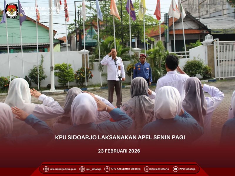 #TemanPemilih, Komisi Pemilihan Umum Kabupaten Sidoarjo (KPU Sidoarjo) melaksanakan Apel Pagi sebagai wujud kedisiplinan dan sarana koordinasi mingguan pada Senin (23/2/2026). Kegiatan tersebut berlangsung di halaman Kantor KPU Sidoarjo, Jalan Raya Cemengkalang Nomor 1, Kabupaten Sidoarjo.