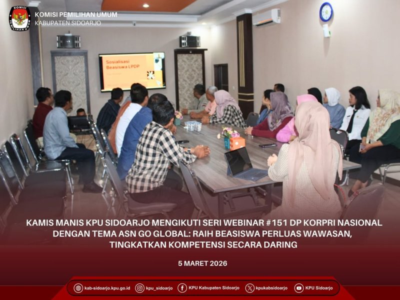 Pada #KamisManis ini Komisi Pemilihan Umum Kabupaten Sidoarjo (KPU Sidoarjo) mengikuti Webinar ASN dengan tema ASN Go Global: Raih Beasiswa, Perluas Wawasan, Tingkatkan Kompetensi I DP KORPRI Nasional yang diselenggarakan oleh Dewan Pengurus (DP) KORPRI Nasional pada Kamis, 5 Maret 2026, melalui media daring.