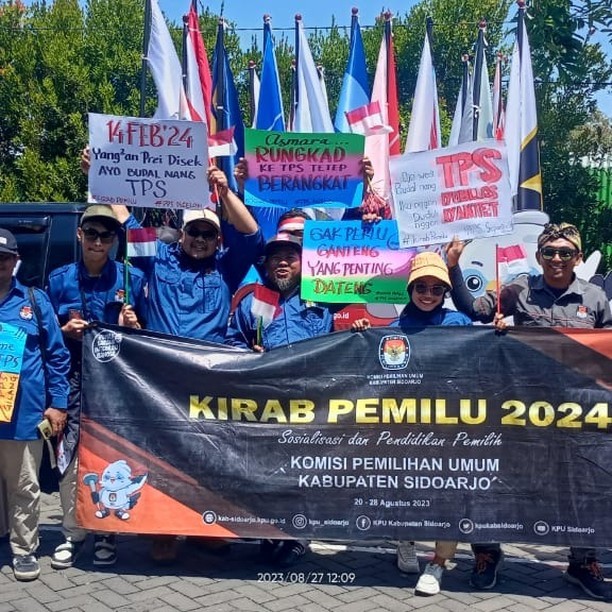 KPU Kabupaten Sidoarjo melaksanakan agenda Kirab Pemilu hari terakhir di tiga Kecamatan hari Minggu ini (27/8) yakni di Kecamatan Wonoayu, Sukodono dan Taman.