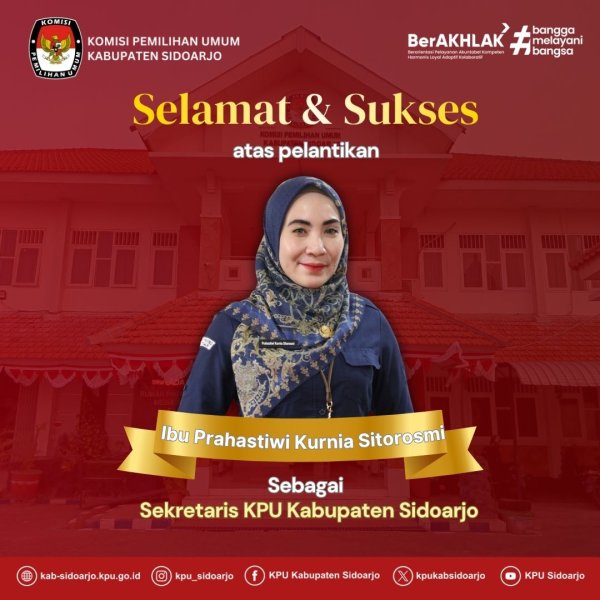 Selamat atas pelantikan Ibu Prahastiwi Kurnia Sitorosmi sebagai Sekretaris Komisi Pemilihan Umum Kabupaten Sidoarjo.