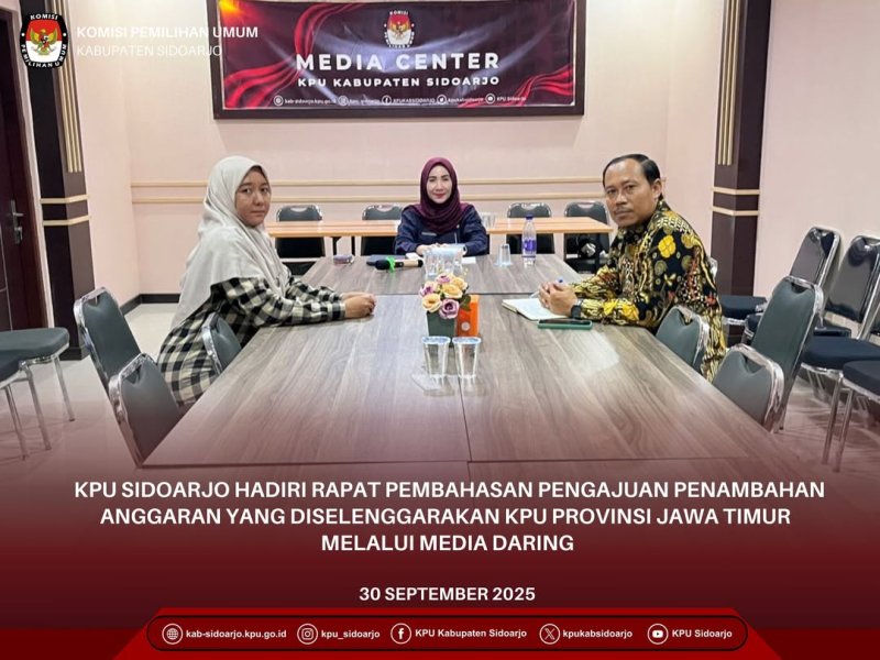 #TemanPemilih, Komisi Pemilihan Umum (KPU) Kabupaten Sidoarjo menghadiri Rapat Pembahasan Pengajuan Penambahan Anggaran yang diselenggarakan KPU Provinsi Jawa Timur pada 30 September 2025 melalui media daring. Divisi Perencanaan Dan Logistik KPU Provinsi Jawa Timur, Miftahur Rozaq, menyampaikan bahwa giat ini dilakukan bertujuan mengoordinasikan pengajuan tambahan anggaran sewa gudang. Hal ini diperlukan karena penghapusan logistik Pilkada 2024 belum seluruhnya tuntas sesuai jadwal, sementara kontrak sewa gudang beberapa KPU Kabupaten/Kota telah berakhir. Koordinasi ini penting untuk membahas ketentuan dan kebijakan Biro Perencanaan terkait tambahan anggaran sewa gudang. KPU Provinsi telah melakukan supervisi dan monitoring di beberapa satuan kerja (satker) di Jawa Timur. Bagi satker yang belum terpantau langsung, diminta melengkapi instrumen supervisi dan monitoring yang telah dibagikan melalui grup media daring. Data ini akan menjadi dasar pembahasan dalam revisi anggaran dalam langkah-langkah akhir tahun di tingkat DJA untuk dilaporkan kepada KPU RI. Selain itu, KPU Provinsi juga menekankan pentingnya efisiensi anggaran, khususnya terkait kebutuhan penyimpanan. KPU Provinsi mengimbau agar KPU Kabupaten/Kota memaksimalkan pemanfaatan aset yang tersedia. Jika masih ada ruang kantor atau gudang milik sendiri yang layak digunakan, maka langkah yang lebih tepat adalah mengusulkan pemeliharaan atau perbaikan, bukan menyewa gudang baru. Pendekatan ini dinilai lebih hemat sekaligus berkelanjutan. Hadir dalam kegiatan ini Sekretaris KPU Kab Sidoarjo, Prahastiwi Kurnia Sitorosmi; serta Kepala Subbagian Keuangan, Umum, dan Logistik, Achmad Eko Budianto; Kepala Subbagian Perencanaan Data dan Informasi. Anieq Fardah; serta Staff Perencanaan Data dan Informasi, Nafiuna Hidayatus Saidah. #KPUMelayani