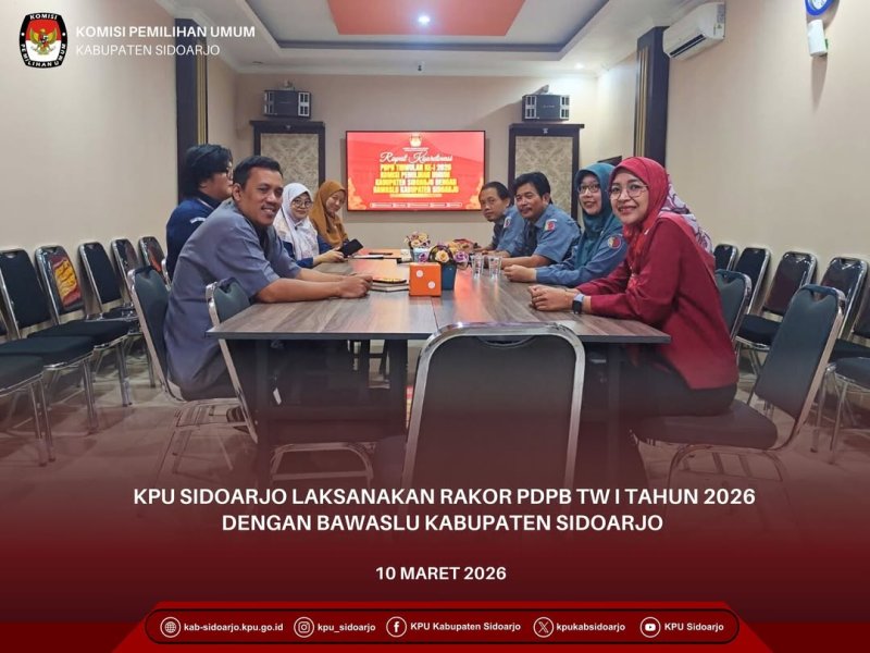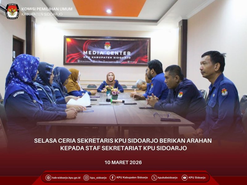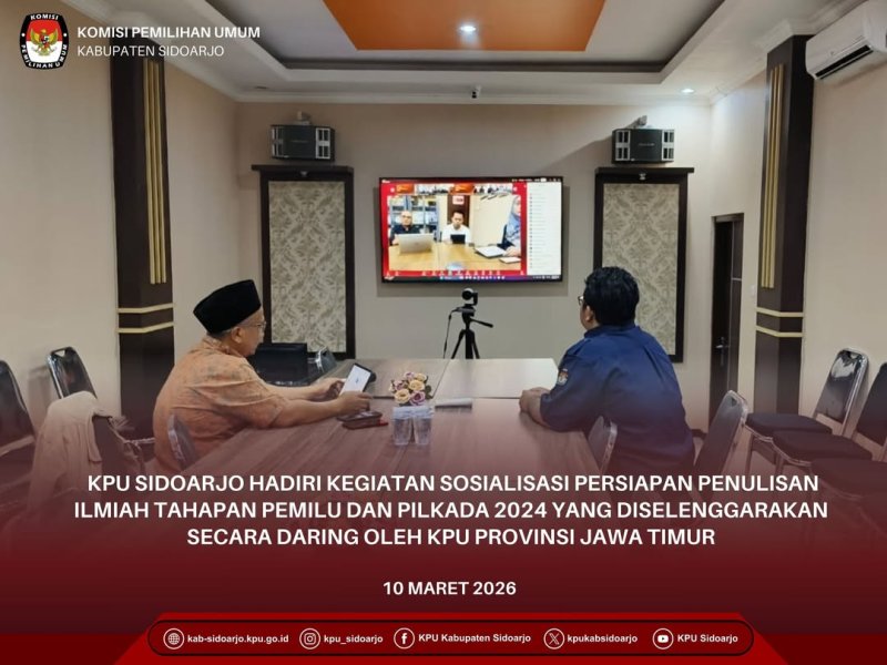 Halo #TemanPemilih ???? Komisi Pemilihan Umum (KPU) Kabupaten Sidoarjo menghadiri kegiatan Sosialisasi Persiapan Penulisan Ilmiah Tahapan Pemilu dan Pilkada 2024 yang diselenggarakan secara daring oleh KPU Provinsi Jawa Timur pada Selasa, 10 Maret 2026. Kegiatan ini diikuti oleh jajaran KPU kabupaten/kota se-Jawa Timur sebagai bagian dari upaya mendokumentasikan pengalaman dan proses penyelenggaraan tahapan Pemilu dan Pilkada 2024 dalam bentuk karya tulis ilmiah. Ketua KPU Provinsi Jawa Timur, Aang Kunaifi, dalam sambutannya menyampaikan bahwa penulisan karya ilmiah dibutuhkan sebagai dasar pustaka keilmuan kedepan, sehingga semoga nantinya dapat membantu pihak-pihak yang membutuhkan. Dalam kegiatan ini, Anggota KPU Provinsi Jawa Timur divisi Teknis Penyelenggaraan, Choirul Umam, memberikan arahan mengenai struktur penulisan, tema yang dapat diangkat, serta pentingnya mengangkat praktik baik (best practices) dan pembelajaran selama pelaksanaan tahapan pemilu dan pilkada. Dengan adanya kegiatan ini, diharapkan pengalaman penyelenggaraan Pemilu dan Pilkada 2024 dapat terdokumentasi secara sistematis dan memberikan manfaat bagi peningkatan kualitas penyelenggaraan pemilu ke depan. Hadir dalam kegiatan ini adalah Anggota KPU Kabupaten Sidoarjo divisi Teknis Penyelenggaraan Haidar Munjid dan Kepala beserta Staf Subbagian Teknis Penyelenggaraan Pemilu dan Hukum. #KPUMelayani
