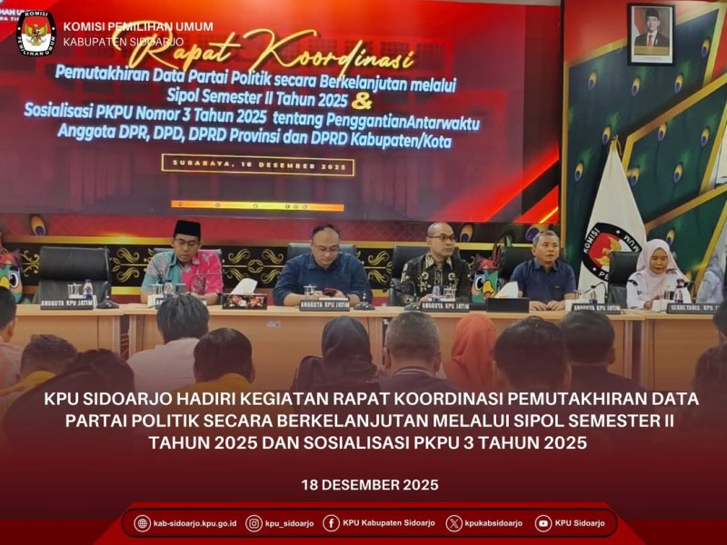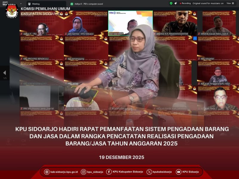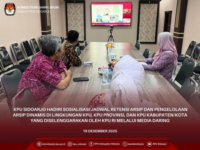 #TemanPemilih, Komisi Pemilihan Umum (KPU) Kabupaten Sidoarjo menghadiri Sosialisasi Jadwal Retensi Arsip dan Pengelolaan Arsip Dinamis di Lingkungan KPU, KPU Provinsi dan KPU Kabupaten/Kota yang diselenggarakan oleh KPU Republik Indonesia pada tanggal 19 Desember 2025 melalui Daring. Rizki Indah Susanti selaku Kepala Bagian Persuratan & TU Pimpinan KPU RI dalam menyampaikan bahwa kegiatan ini bertujuan meningkatkan pemahaman dan keterampilan penataan serta pengelolaan arsip sesuai kaidah kearsipan. Arsip memiliki peranan yang sangat penting. KPU sebagai penyelenggara pemilu dan pemilihan menghasilkan arsip pemilu dan pemilihan. Arsip pemilu dan pemilihan merupakan seluruh dokumen, data, dan rekaman resmi yang dihasilkan selama tahapan pemilu dan pemilihan, mulai dari perencanaan, pelaksanaan, hingga penetapan hasil, yang disimpan secara sistematis sebagai bukti penyelenggaraan demokrasi. Materi pertama disampaikan oleh Rayi Darmagara, Perancang Peraturan Perundang-undangan Madya ANRI, yang membahas Jadwal Retensi Arsip (JRA) beserta kegunaannya. JRA memuat jenis atau seri arsip, masa simpan, serta penetapan nasib akhir arsip, yaitu permanen, dimusnahkan, atau dinilai kembali. Kegiatan dilanjutkan dengan materi kedua oleh Diantyo Nugroho, Arsiparis Ahli Madya Direktorat Kearsipan Pusat, yang menjelaskan pentingnya pengelolaan arsip untuk mendukung efisiensi kerja, akuntabilitas layanan, kepatuhan terhadap peraturan perundang-undangan, perlindungan hukum dan manajemen risiko, serta pelestarian memori kolektif organisasi dan bangsa. Selain itu, dipaparkan pula pengertian Tata Naskah Dinas dan Sistem Klasifikasi Keamanan dan Akses Arsip Dinamis (SKKAAD) sebagai dasar perlindungan hak pencipta arsip dan hak akses publik. Hadir dalam kegiatan ini Sekretaris KPU Kabupaten Sidoarjo, Prahastiwi Kurnia Sitorosmi; Kepala Subbagian Keuangan Umum dan Logistik KPU Kabupaten Sidoarjo, Achmad Eko Budianto; beserta Operator Kearsipan KPU Kabupaten Sidoarjo, Indah Suryaningsih. #KPUMelayani