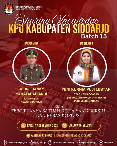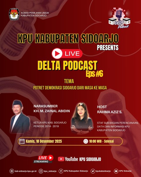 #TemanPemilih, Komisi Pemilihan Umum Kabupaten Sidoarjo (KPU Sidoarjo) kembali menyapa masyarakat melalui Live Delta Podcast yang akan disiarkan pada Kamis, 18 Desember 2025, mulai pukul 10.00 WIB hingga selesai melalui YouTube KPU Sidoarjo. Pada episode kali ini, Delta Podcast mengangkat tema “Potret Demokrasi Sidoarjo dari Masa ke Masa”, sebuah topik reflektif yang mengulas perjalanan demokrasi di Kabupaten Sidoarjo, mulai dari dinamika pemilu di masa lalu hingga tantangan dan harapan demokrasi di era modern. Tema ini diharapkan dapat memperkaya pemahaman publik tentang nilai-nilai demokrasi yang terus tumbuh dan berkembang di tengah masyarakat. Live podcast ini akan menghadirkan KH. M. Zainal Abidin, Ketua KPU Kabupaten Sidoarjo Periode 2014 - 2019, sebagai narasumber. Dalam perbincangan ini, beliau akan berbagi pandangan mengenai peran organisasi kemasyarakatan, khususnya NU, dalam menjaga demokrasi, memperkuat partisipasi masyarakat, serta merawat nilai kebangsaan dan toleransi dalam setiap proses politik dan pemilu. Diskusi akan mengulas berbagai potret penyelenggaraan demokrasi di Sidoarjo dari waktu ke waktu, termasuk peran masyarakat sipil, tokoh agama, dan lembaga penyelenggara pemilu dalam menciptakan demokrasi yang inklusif, damai, dan bermartabat. Melalui Delta Podcast, KPU Sidoarjo terus berkomitmen menghadirkan ruang dialog yang edukatif, inspiratif, dan mudah diakses oleh masyarakat sebagai bagian dari upaya pendidikan pemilih dan penguatan demokrasi lokal. Jangan lewatkan siaran langsungnya dan ikuti diskusi menarik ini. Live di YouTube KPU Sidoarjo: https://youtube.com/live/Ilp7Ae7Yyt4 #KPUMelayani