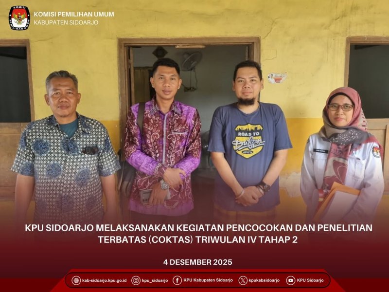 #TemanPemilih, Komisi Pemilihan Umum (KPU) Kabupaten Sidoarjo kembali melaksanakan kegiatan Pencocokan dan Penelitian Terbatas (Coktas) triwulan IV Tahap 2 mulai Kamis, 4 Desember 2025 hingga 15 Desember 2025. Pada tahap ini, fokus kegiatan diarahkan secara khusus kepada pemilih Kabupaten Sidoarjo yang teridentifikasi berdasarkan data dari kementrian luar negeri berdomisili di luar negeri. Kegiatan ini merupakan bagian dari Pemutakhiran Data Pemilih Berkelanjutan (PDPB) yang salah satu bertujuannya untuk memelihara dan memperbaharui DPT Pemilu dan/atau Pemilihan terakhir secara berkelanjutan untuk penyusunan DPT pada Pemilu dan/atau Pemilihan berikutnya dengan tetap menjamin kerahasiaan data; Dalam pelaksanaannya, KPU Sidoarjo melakukan koordinasi intensif dengan pemerintah desa, serta pihak keluarga pemilih yang berada di luar negeri. Verifikasi terhadap pemilih luar negeri ini merupakan langkah penting guna memastikan daftar pemilih tetap sesuai dengan prinsip komprehensif, akurat, mutakhir, dan inklusif sebagaimana diamanatkan dalam PKPU Nomor 1 Tahun 2025 tentang Pemutakhiran Data Pemilih Berkelanjutan. KPU Sidoarjo juga mengajak masyarakat untuk proaktif memberikan informasi apabila mengetahui anggota keluarga atau warga di lingkungan sekitar yang sedang berada di luar negeri namun belum tercatat dengan benar dalam data pemilih. Kolaborasi ini diharapkan mampu mewujudkan daftar pemilih yang lebih berkualitas dan dapat dipertanggungjawabkan. Turut melaksanakan kegiatan Coktas triwulan IV Tahap 2 ini Ketua KPU Sidoarjo Fauzan Adim, Ahmad Nidhom (Divisi Hukum dan Pengawasan), serta M. Natsiruddin Yahya (Divisi Perencanaan, Data dan Informasi). Hadir pula Sekretaris KPU Sidoarjo Prahastiwi Kurnia Sitorosmi, beserta jajaran Kasubbag dan staf KPU Sidoarjo. #KPUMelayani