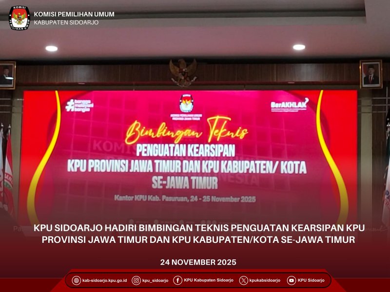 #TemanPemilih, Komisi Pemilihan Umum (KPU) Kabupaten Sidoarjo menghadiri Bimbingan Teknis (BIMTEK) Penguatan Kearsipan KPU Provinsi Jawa Timur dan KPU Kabupaten Kota Se- Jawa Timur yang diselenggarakan oleh KPU Provinsi Jawa Timur pada 24 -25 November 2025 melalui Luring di Kantor KPU Kabupaten Pasuruan. Arsiparis Ahli Muda Dinas Kearsipan Daerah, Suhartining, dalam giat ini menjelaskan bahwa arsip memiliki beragam manfaat strategis, mulai dari perencanaan, pengambilan keputusan, pertanggungjawaban, perlindungan aset, pengaturan kerahasiaan informasi, hingga peningkatan pelayanan publik. Karena itu, penatausahaan arsip menjadi aspek yang sangat penting di lingkungan KPU Provinsi dan KPU Kabupaten/Kota se-Jawa Timur. Melalui bimtek ini, peserta diharapkan mampu menerapkan sistem kearsipan yang lebih tertib, akuntabel, dan sesuai regulasi untuk mendukung transparansi serta kesiapan kelembagaan dalam menghadapi tahapan pemilu mendatang. Dalam Giat ini dipaparkan bahwa ruang lingkup pengelolaan Arsip dilakukan terhadap arsip dinamis dan arsip statis. Arsip dinamis menjadi tanggung jawab pencipta arsip, sedangkan arsip statis dikelola oleh lembaga kearsipan ANRI LKD Prov maupun Kab/Kota. Lebih lanjut, dipaparkan pula bahwa pengelolaan arsip dinamis wajib didukung empat instrumen utama, yaitu tata naskah dinas, klasifikasi arsip, jadwal retensi arsip, dan sistem klasifikasi keamanan serta akses arsip. Seluruh instrumen tersebut ditetapkan oleh masing-masing pencipta arsip berdasarkan pedoman dari Kepala ANRI. Hadir dalam kegiatan ini Kasubbag KUL KPU Kabupaten Sidoarjo, Achmad Eko Budianto beserta Operator Srikandi KPU Kabupaten Sidoarjo, Indah Suryaningsih #KPUMelayani