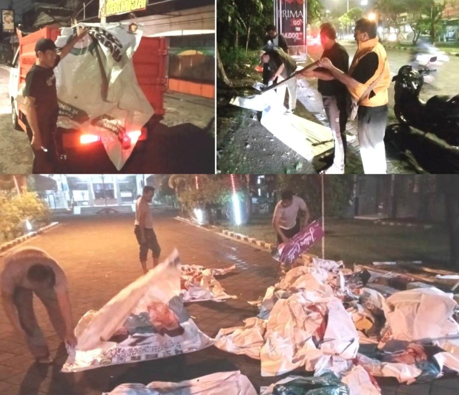 Petugas Tim Gabungan KPU Sidoarjo, Bawaslu Sidoarjo dan OPD terkait didukung unsur keamaman mencopoti APK Paslon Pilkada 2024, saat memasuki masa tenang.