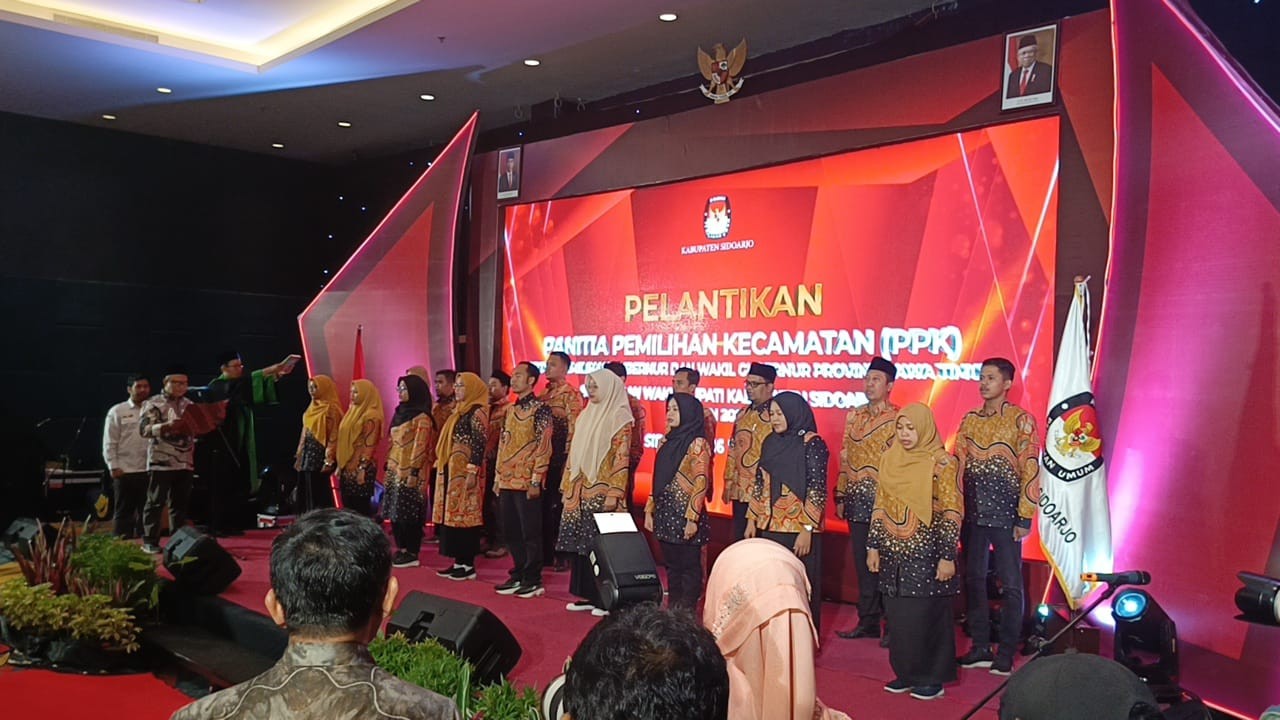 Komisi Pemilihan Umum Kabupaten Sidoarjo melaksanakan pelantikan kepada Panitia Pemilihan Kecamatan (PPK) terpilih. PPK yang dilantik mengucapkan sumpah jabatan saat pelantikan di Luminor Hotel Sidoarjo, Jawa Timur, Kamis (16/5/2024). Sebanyak 90 PPK Sidoarjo dilantik untuk ditempatkan di 18 kecamatan guna terselenggaranya pemilihan kepala daerah 2024.