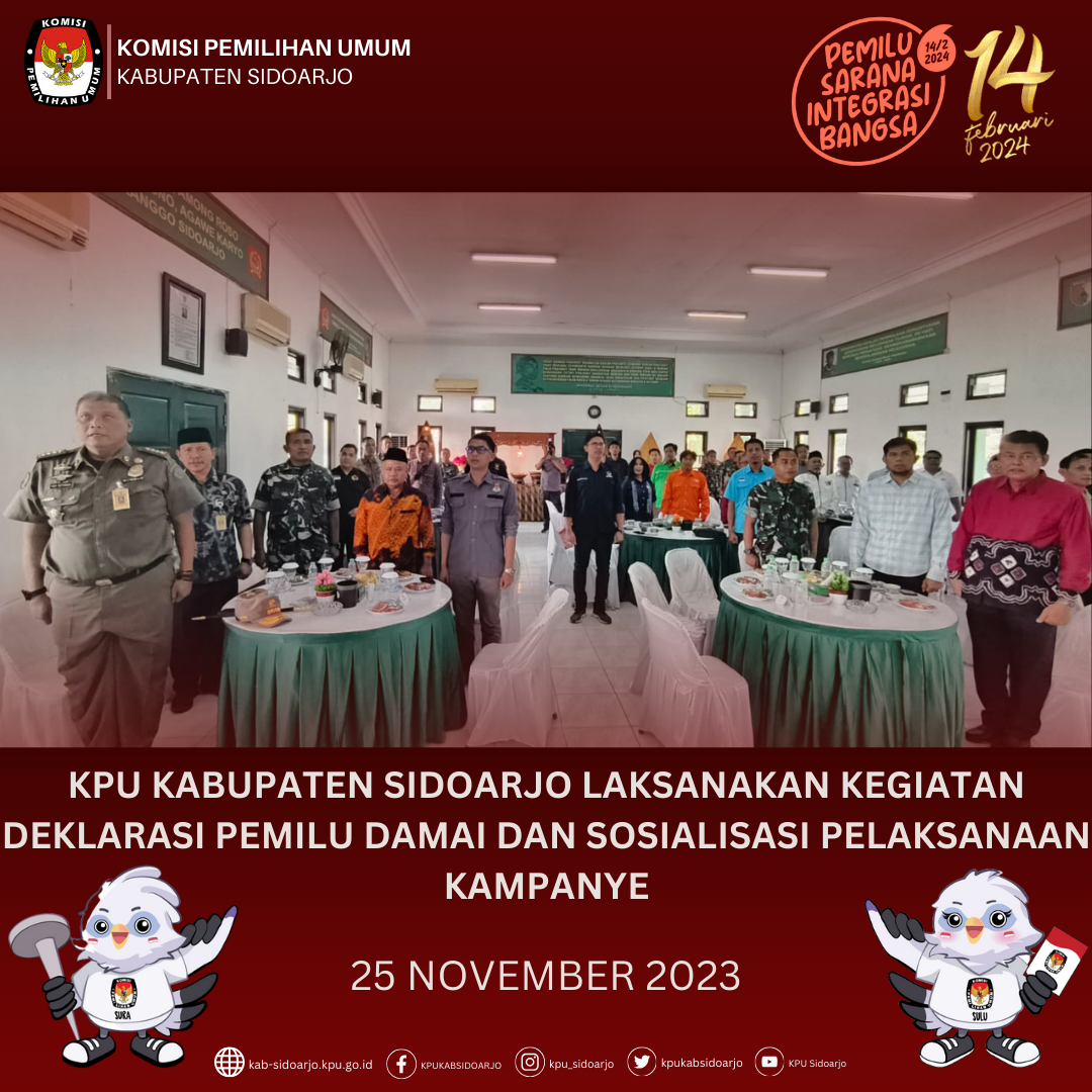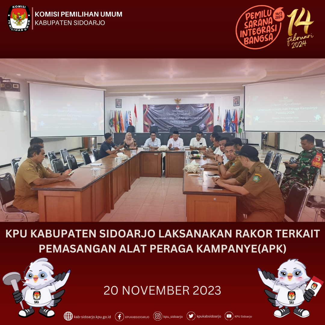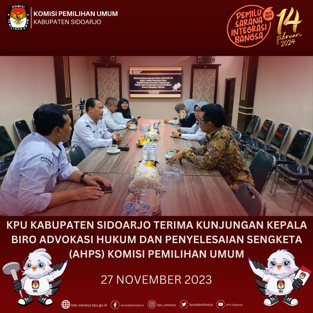 KPU Kabupaten Sidoarjo laksanakan kegiatan Audiensi dalam rangka Kunjungan Kerja Komisi Dua DPR RI Ke Kabupaten Sidoarjo pada hari Senin (27/11). Kegiatan dilaksanakan pada pukul 10.00 WIB bertempat di Pendopo Delta Wibawa Sidoarjo. Hadir dalam kegiatan tersebut adalah Anggota Komisi Dua DPR RI, Bupati Sidoarjo, Ketua KPU Provinsi Jawa Timur, Bawaslu Provinsi Jawa Timur, Pimpinan Dinas Terkait di Kabupaten Sidoarjo, Ketua Bawaslu Sidoarjo, Ketua KPU Kabupaten Sidoarjo, Mukhamad Iskak, Anggota KPU Kabupaten Sidoarjo divisi Hukum dan Pengawasan, Achmad Labib dan Sekretaris KPU Kabupaten Sidoarjo, Sulaiman, beserta jajaran Sekretariat. Kegiatan diawali dengan sambutan yang diberikan perwakilan Anggota Komisi Dua DPR RI, Aminurokhman dan dilanjutkan oleh Bupati Kabupaten Sidoarjo, Ahmad Muhdlor Ali. Kemudian berturut-turut KPU Provinsi Jawa Timur, KPU Kabupaten Sidoarjo dan Bawaslu Kabupaten Sidoarjo menyampaikan paparan terkait persiapan menuju hari Pemilihan pada 14 Februari 2024 disertai dengan tanya jawab dengan Anggota Komisi Dua DPR RI. Kegiatan berlangsung hingga pukul 12.00 WIB. Selanjutnya rombongan Anggota Komisi Dua DPR RI didampingi Ketua KPU Provinsi Jawa Timur, Choirul Anam dan Ketua KPU Kabupaten Sidoarjo, Mukhamad Iskak, melakukan kunjungan ke gudang penyimpanan Logistik Pemilu yang berada di Jl Airlangga 7-9 Sidoarjo.