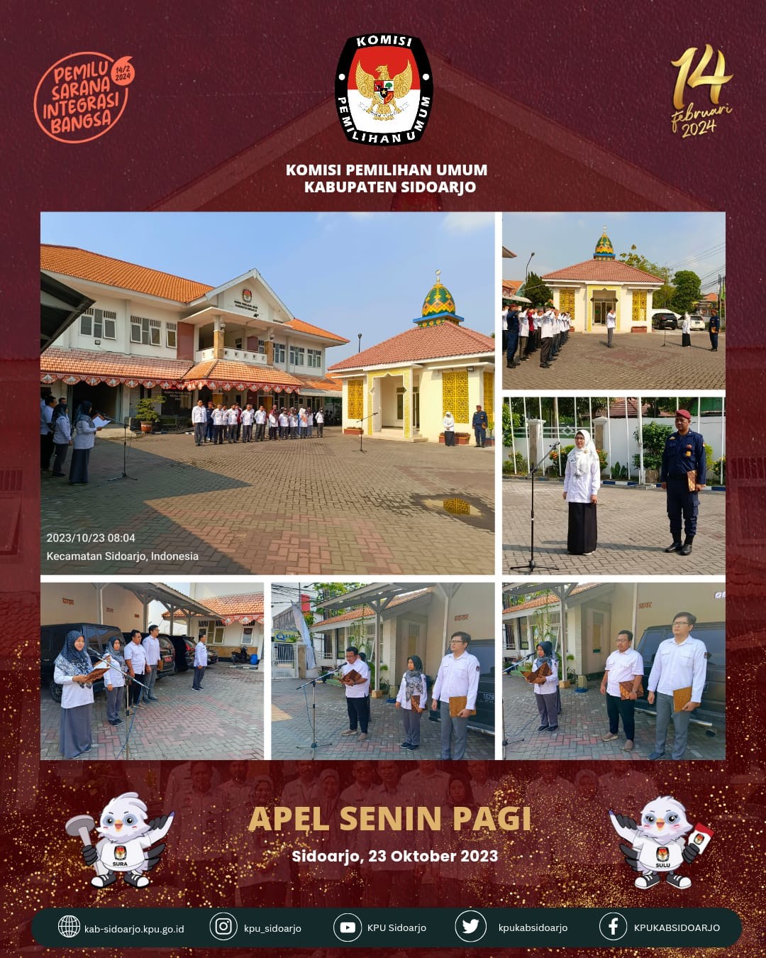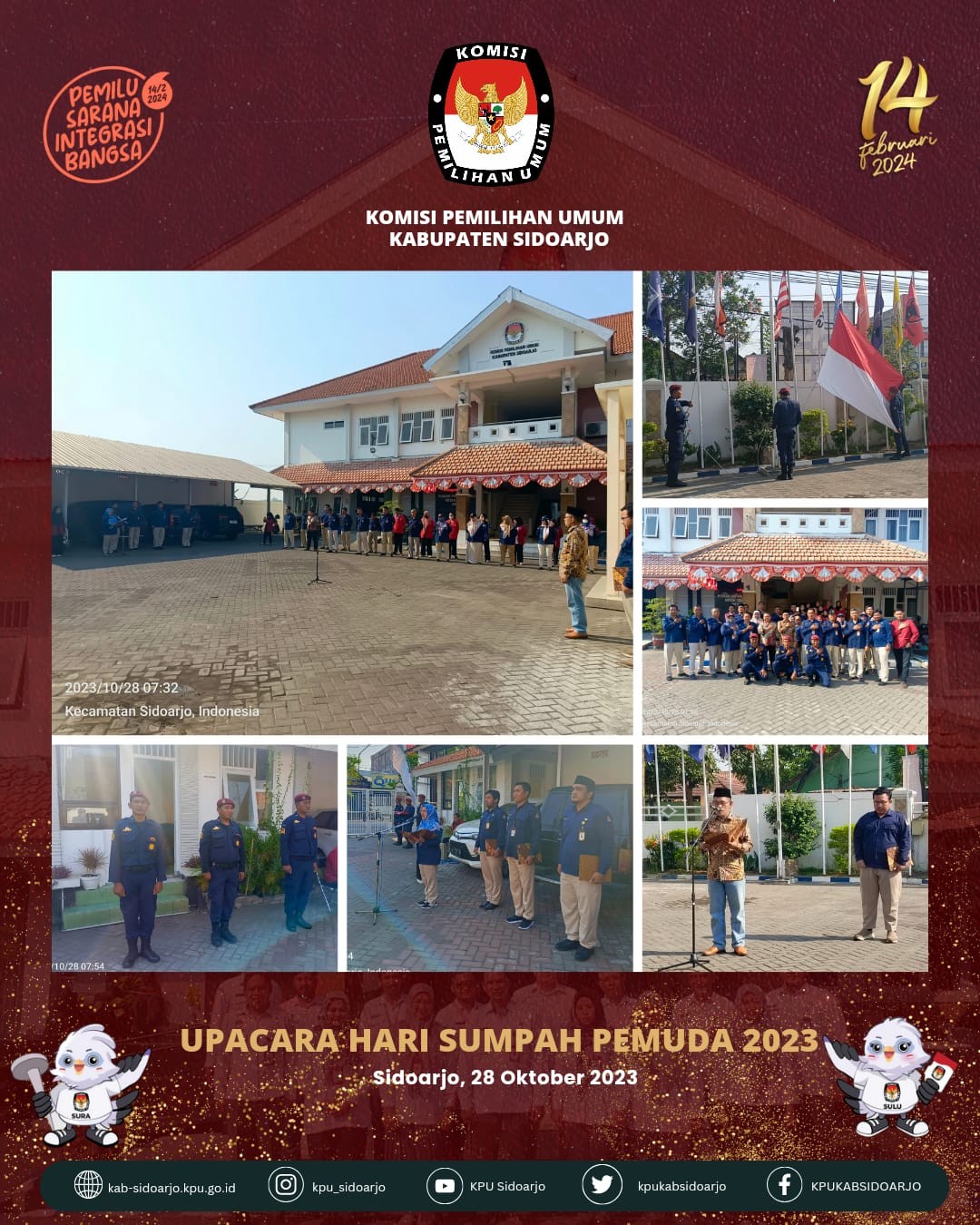Teman Pemilih, Sabtu (28/10/2023) KPU Kabupaten Sidoarjo laksanakan upacara Hari Sumpah Pemuda ke-95 yang diikuti oleh anggota KPU Kabupaten Sidoarjo, Sekretaris, Kasubbag, Staf, tenaga pendukung dan siswa magang, di halaman KPU Sidoarjo. Pada upacara yang dimulai pada pukul 07.30 WIB tersebut Anggota KPU Kabupaten Sidoarjo Divisi Hukum dan Pengawasan Achmad Labib bertindak sebagai pembina upacara, dan staf KPU Sidoarjo Bambang Pujianto sebagai komandan upacara. Adapun yang bertugas sebagai MC Rahma Tinova, Pembaca Pembukaan UUD 1945 Danny Ferdiansyah, Ajudan Ilham, Pembaca Putusan Kongres 1928 Hernowo, Pembaca Doa Syam Rahmanto, dan Pengibar Bendera Merah Putih Jagat Saksana KPU Sidoarjo yakni, Nova Dwi Nugroho S, Hani Achmad, dan Hendra Purdiyanto Achmad Labib dalam pidatonya membacakan teks amanat pembina upacara dari kemenpora 2023 "Momentum Sumpah Pemuda mengingatkan bangsa Indonesia terhadap sejarah gotong royong seluruh elemen pemuda yang berhasil menebar semangat jiwa patriotisme sekaligus menyatukan visi kebangsaan dalam Sumpah Pemuda 1928 yang melahirkan sebuah komitmen kebangsaan yaitu bertumpah darah satu tanah air Indonesia, berbangsa satu bangsa Indonesia, dan menjunjung bahasa persatuan bahasa Indonesia." tutur Labib