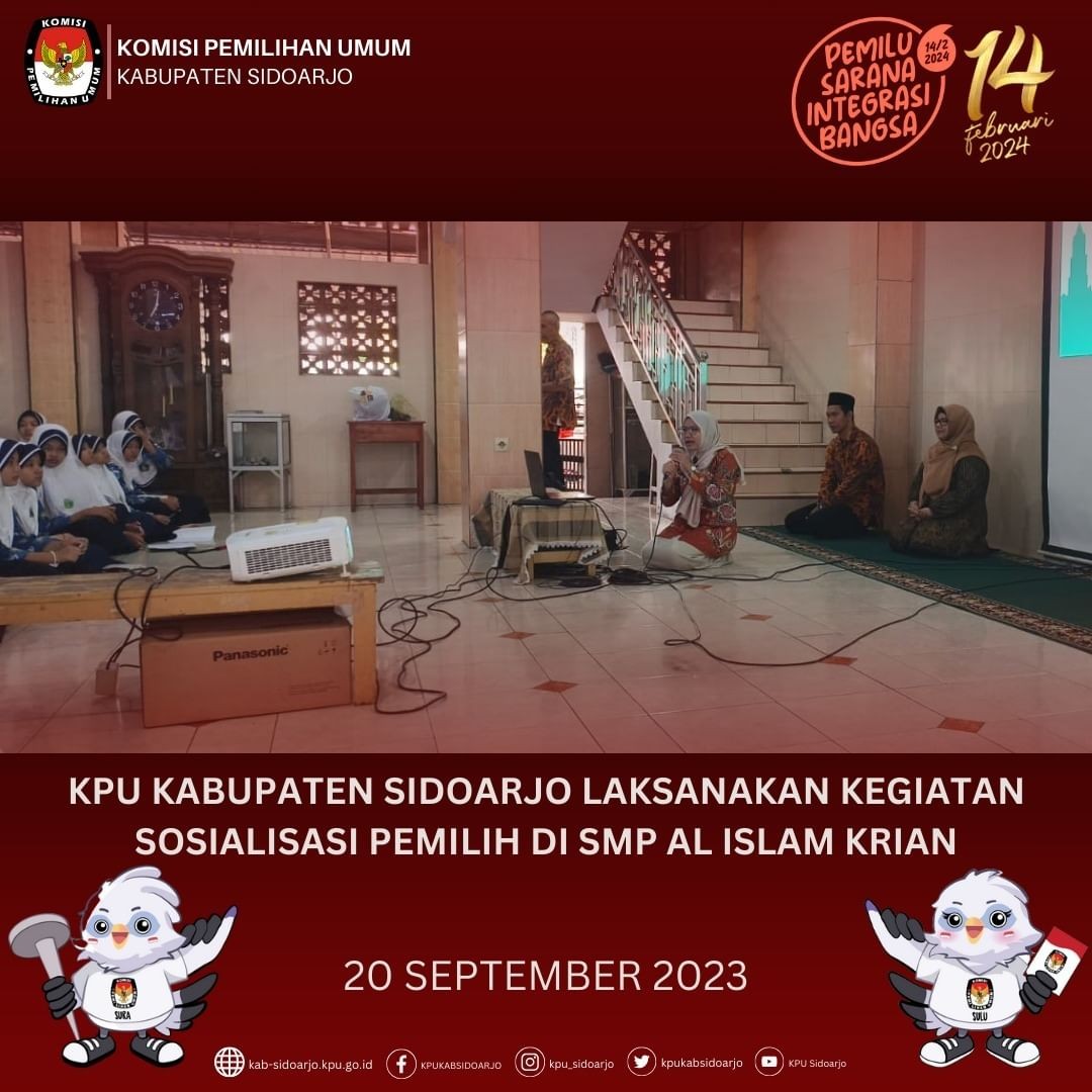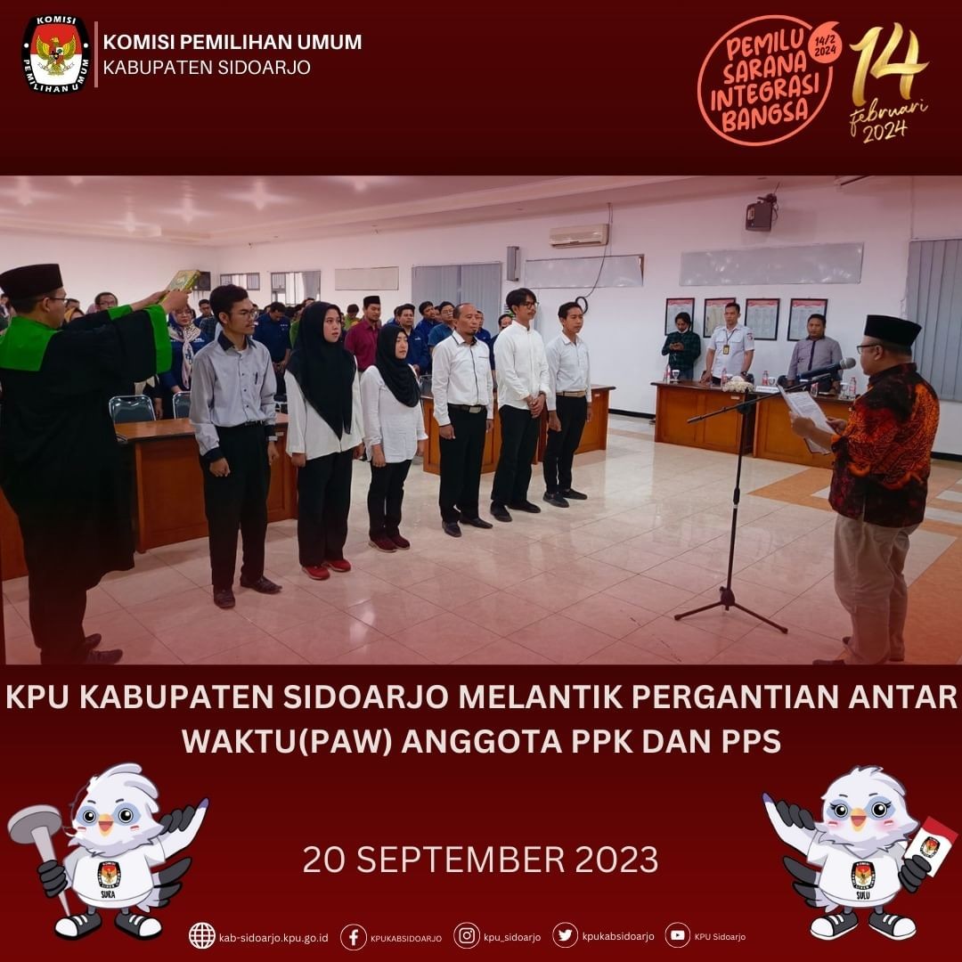 Komisi Pemilihan Umum (KPU) Kabupaten Sidoarjo melantik Pengganti Antar Waktu (PAW) anggota Panitia Pemilihan Kecamatan dan Pengganti Antar Waktu anggota Panitia Pemungutan Suara (PPS). 2 orang PAW anggota PPK dilantik berasal dari 2 Kecamatan di wilayah Kabupaten Sidoarjo yaitu Kecamatan Waru a.n. M Hajir dan Kecamatan Sidoarjo a.n. Sahrudian Ahmad. Sedangkan 4 PAW PPS berasal dari desa Medalem Kec Tulangan a.n. Rizqi Ihya Ulumuddin, desa Kedungsolo Kec. Porong a.n. Ayustin Suryaningrum, sedangkan dari Kec Sidoarjo ada dua PAW PPS yakni Kelurahan Lemahputro a.n. Emmy Juniarti dan Kelurahan Sekardangan a.n. M Irsadul Kegiatan pelantikan PAW anggota PPS dalam Pemilihan Umum Tahun 2024 ini dilaksanakan di ruang hall Komisi Pemilihan Umum Kabupaten Sidoarjo, Jalan Cemeng Kalang Raya no.1 Rabu (20/9/2023). Acara pelantikan ini dihadiri oleh lima komisioner KPU Kabupaten Sidoarjo M. Iskak beserta jajaran serta Sekretaris KPU Kabupaten Sidoarjo Sulaiman, Anggota Badan Pengawas Pemilu (Bawaslu) Kabupaten Sidoarjo Muh. Arif dan juga 90 anggota Panitia Pemilihan Kecamatan (PPK) Ketua KPU Kabupaten Sidoarjo, Mokhamad Iskak berharap kepada 2 anggota PAW PPK dan 4 orang PAW PPS yang baru dilantik untuk segera menyesuaikan diri dengan tugasnya, karena tahapan Pemilihan Umum Tahun 2024 sudah berjalan. Serta ia tidak lupa berpesan agar mulai saat ini anggota PPK dan PPS terlantik untuk menjaga diri dalam berkomentar dimanapun karena telah resmi menjadi bagian dari penyelenggara Pemilu. Setelah itu, acara dilanjutkan dengan evaluasi internal badan adhoc KPU Kabupaten Sidoarjo terutama anggota PPK dengan pemateri seluruh komisioner secara berurutan yang dimulai oleh Anggota Divisi Data dan Perencanaan Musonif Afandi, dilanjutkan oleh Anggota Divisi Teknis Penyelenggaraan Ana Aziza, kemudian Anggota Divisi SDM dan Sosdiklih Parmas Fauzan Adim, lalu Anggota Divisi Hukum dan Pengawasan Achmad Labib dan ditutup oleh Sekretaris KPU Kabupaten Sidoarjo Sulaiman yang menjelaskan tentang aplikasi Sistem Pengawasan Anggaran (SITAB).***(red)