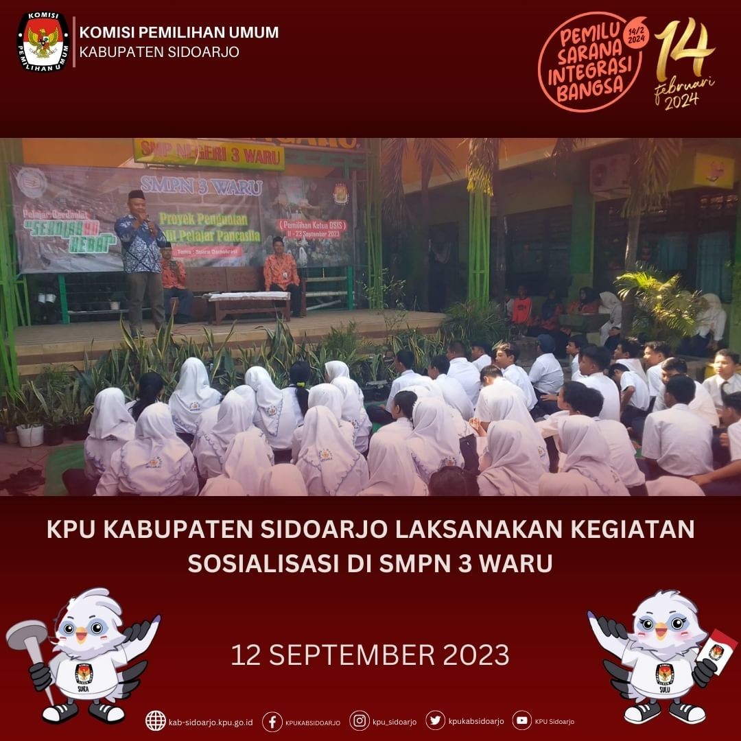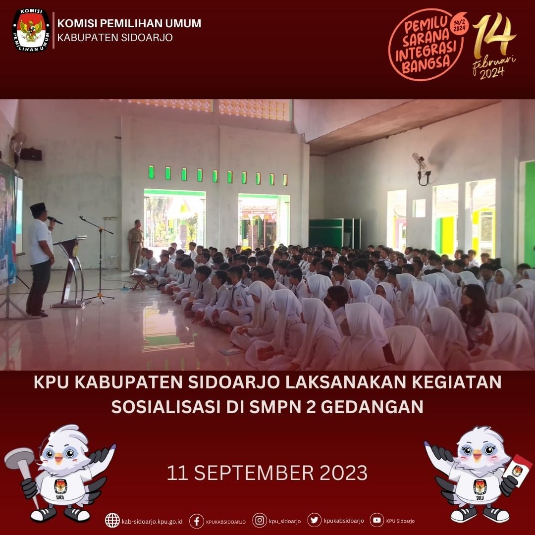 Komisi Pemilihan Umum (KPU) Kabupaten Sidoarjo melaksanakan kegiatan sosialisasi dengan format KPU Goes To School di SMP Negeri 2 Gedangan pada hari ini (11/09). Kegiatan ini merupakan bagian dari pelayanan KPU Kabupaten Sidoarjo dalam memberikan pelayanan sosialisasi kepada pemilih pemula. Hadir mewakili KPU Kabupaten Sidoarjo sekaligus sebagai pemateri, Anggota KPU Kabupaten Sidoarjo divisi Hukum dan Sumber Daya Manusia Achmad Labib. Kegiatan sosialisasi dimulai pada pukul 08.30 bertempat di gedung Aula SMPN 2 Gedangan dengan diawali sambutan dari Wakil Kepala Sekolah SMPN 2 Gedangan yang mengharapkan kegiatan sosialisasi kali ini dapat memberikan edukasi kepada siswa-siswi SMPN 2 Gedangan tentang aspek-aspek demokrasi dan kepemiluan. Achmad Labib dalam materinya menyampaikan tentang ide dasar demokrasi dan bagaimana pemilu dijalankan. Labib menambahkan pentingnya bagi para generasi penerus untuk memahami bahwa mereka memiliki hak untuk menentukan pilihan arah bangsa kedepan. Tak lupa Labib memberikan himbauan tentang bahaya politik uang agar praktek serupa dapat terputus di generasi yang akan datang. Kegiatan ditutup dengan tanya-jawab dengan siswa-siswi yang terlihat antusias.***(red)