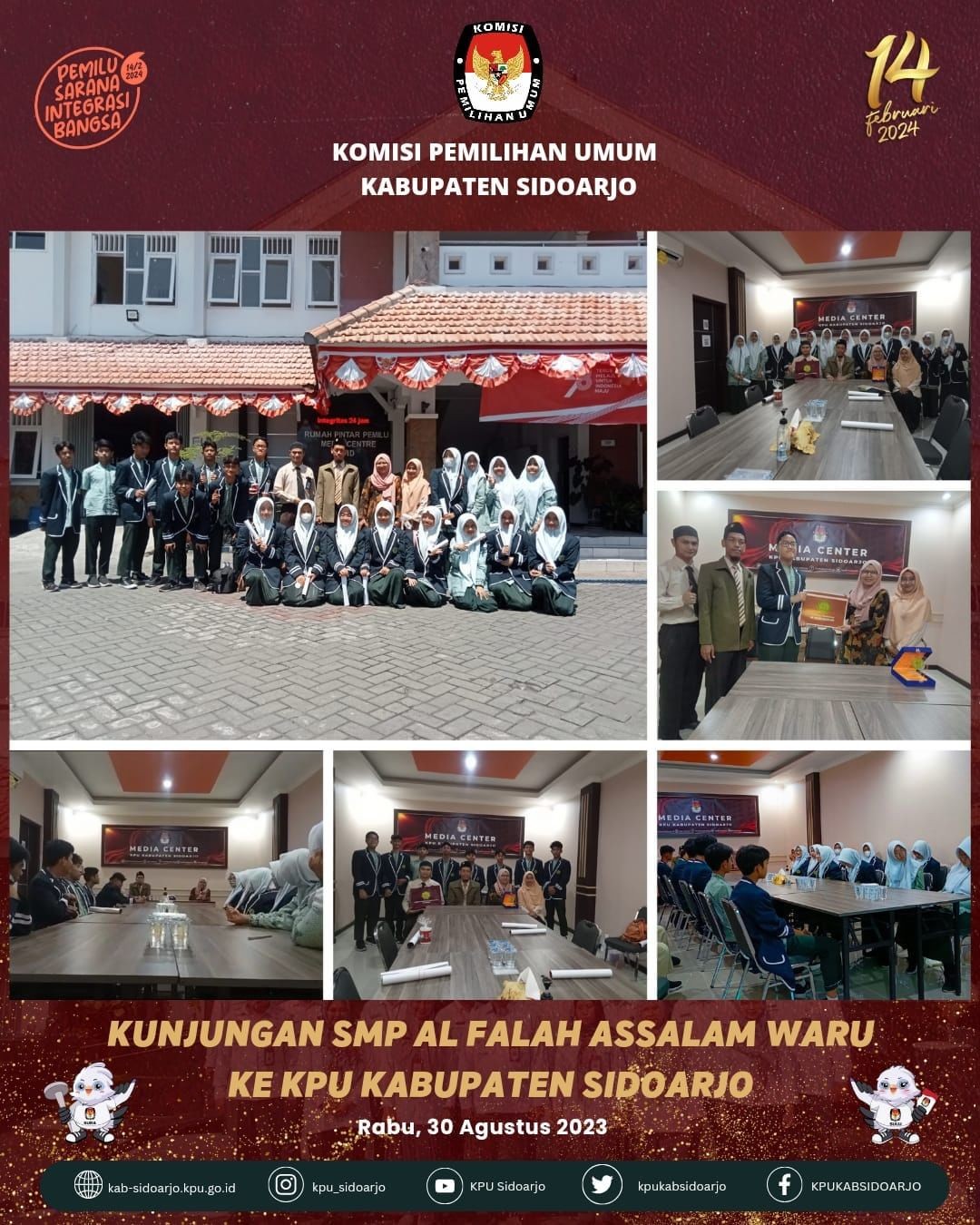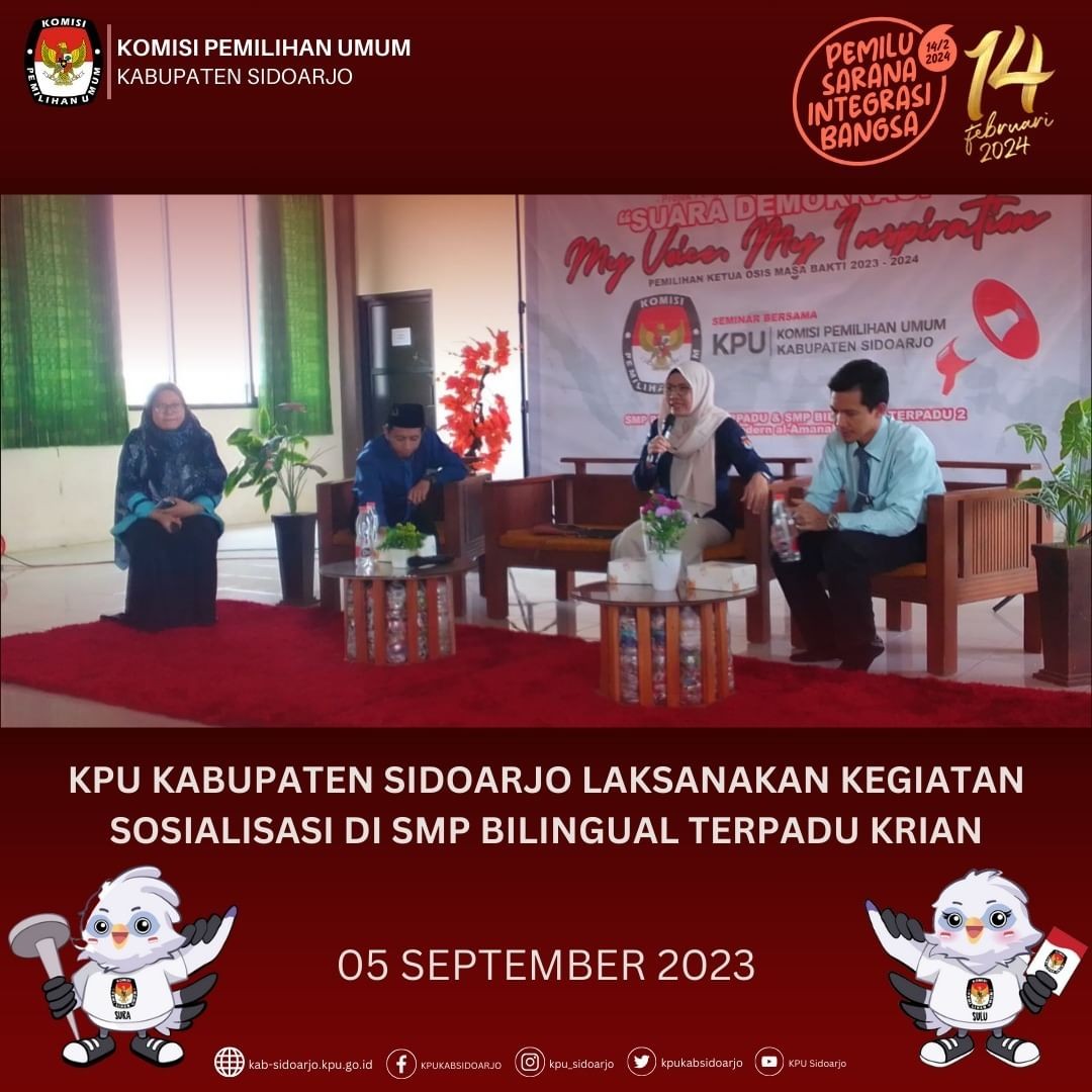 KPU Kabupaten Sidoarjo laksanakan kegiatan sosialisasi di SMP Bilingual Terpadu Krian bertempat di gedung Aula Al Hikmah SMP Bilingual Terpadu di desa Junwangi Kecamatan Krian, pada hari Selasa (05/09). Hadir mewakili KPU Kabupaten Sidoarjo, Anggota KPU Kabupaten Sidoarjo divisi Teknis Penyelenggaraan Pemilu Ana Aziza yang sekaligus menjadi pengisi materi pada kegiatan ini. Diawali dengan sambutan dari Kepala Sekolah SMP Bilingual Terpadu, Saiful Anshori, yang berterima kasih atas kesediaan KPU Kabupaten Sidoarjo terlibat langsung dalam kegiatan sosialisasi kepada pemilih pemula dan berharap kegiatan sosialisasi ini dapat bermanfaat secara langsung maupun tidak langsung bagi para santri, terutama dalam diadakannya kegiatan pemilihan OSIS di waktu dekat. Dalam materi yang diberikan, Ana Azizah memberikan pengetahuan seputar demokrasi dan pemilu, serta mengenalkan para santri kepada aspek-aspek kepemiluan, khususnya agenda pemilu yang paling dekat yaitu pemilu serentak 2024. Ana juga menyampaikan soal bahaya politik uang kepada para santri dengan harapan praktek tersebut dapat dihilangkan pada generasi yang akan datang. Kegiatan kemudian ditutup dengan sesi tanya jawab dan foto bersama yang diikuti para santri dengan antusias.***(red)