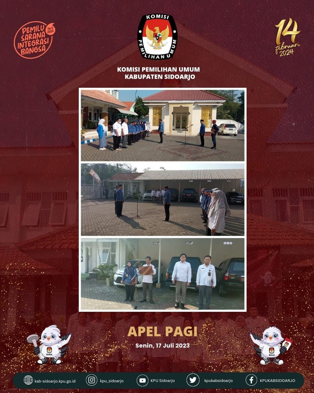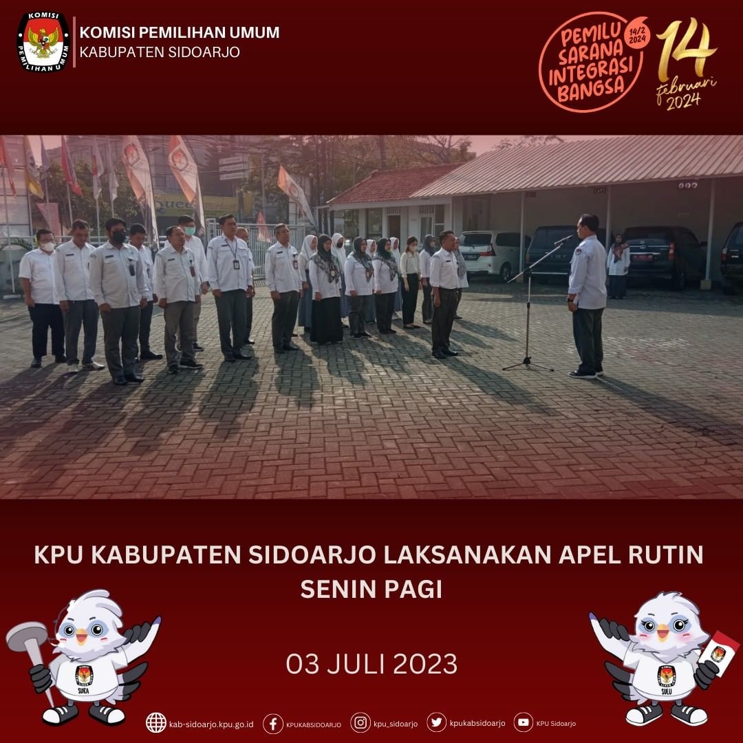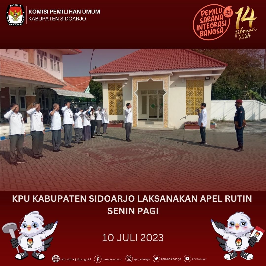 Menindaklanjuti surat KPU Provinsi Jawa Timur nomor 1135/SDM.01-SD/35/2023 perihal tata cara pelaksanaan apel pagi. Apel rutin yang dilaksanakan Komisi Pemilihan Umum (KPU) Kabupaten Sidoarjo menyesuaikan dengan tata cara yang sudah ditentukan. Kegiatan Apel Senin rutin ini diikuti oleh anggota KPU, kasubbag, staf, tenaga pendukung dan siswa magang di hari Senin (10/07/2023). Pada apel tersebut Sekretaris KPU Kabupaten Sidoarjo Sulaiman bertindak sebagai penerima apel, Kasubbag Hukum dan SDM Azis Basuki bertindak sebagai komandan apel, adapun staf Nur Jainuri sebagai pembaca Panca Prasetya Korpri dan Yudianto sebagai pembaca pembukaan UUD 1945 Sulaiman mengapresiasi kehadiran staf KPU Kabupaten Sidoarjo walaupun telah melaksanakan kegiatan penerimaan perbaikan data bakal calon anggota DPRD Kab Sidoarjo hingga larut malam. Tak lupa Sulaiman juga mengingatkan kepada staf KPU Sidoarjo "Kita sudah memasuki awal Semester 2, Ada beberapa hal yang perlu kita selesaikan terutama terkait laporan-laporan semester 1" ujar Sulaiman Sebelum mengakhiri apel, Edwin Prasetiawan yang bertindak sebagai pembaca doa juga mengajak seluruh peserta untuk berdoa bersama agar Allah SWT memberikan semangat dan kelancaran dalam bekerja.***(edw)
