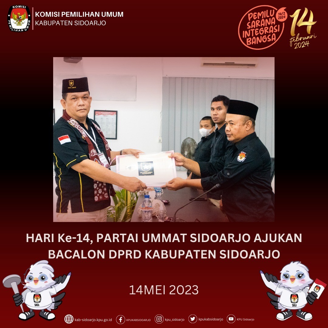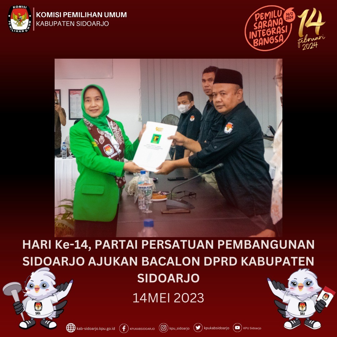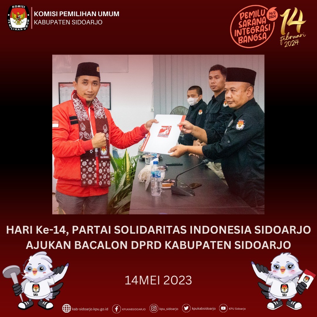 Komisi Pemilihan Umum Daerah (KPUD) Kabupaten Sidoarjo menerima pengajuan dokumen persyaratan bakal calon anggota DPRD dari Partai Solidaritas Indonesia Kabupaten Sidoarjo pada pukul 14.00 WIB, Hari Minggu (14/05).