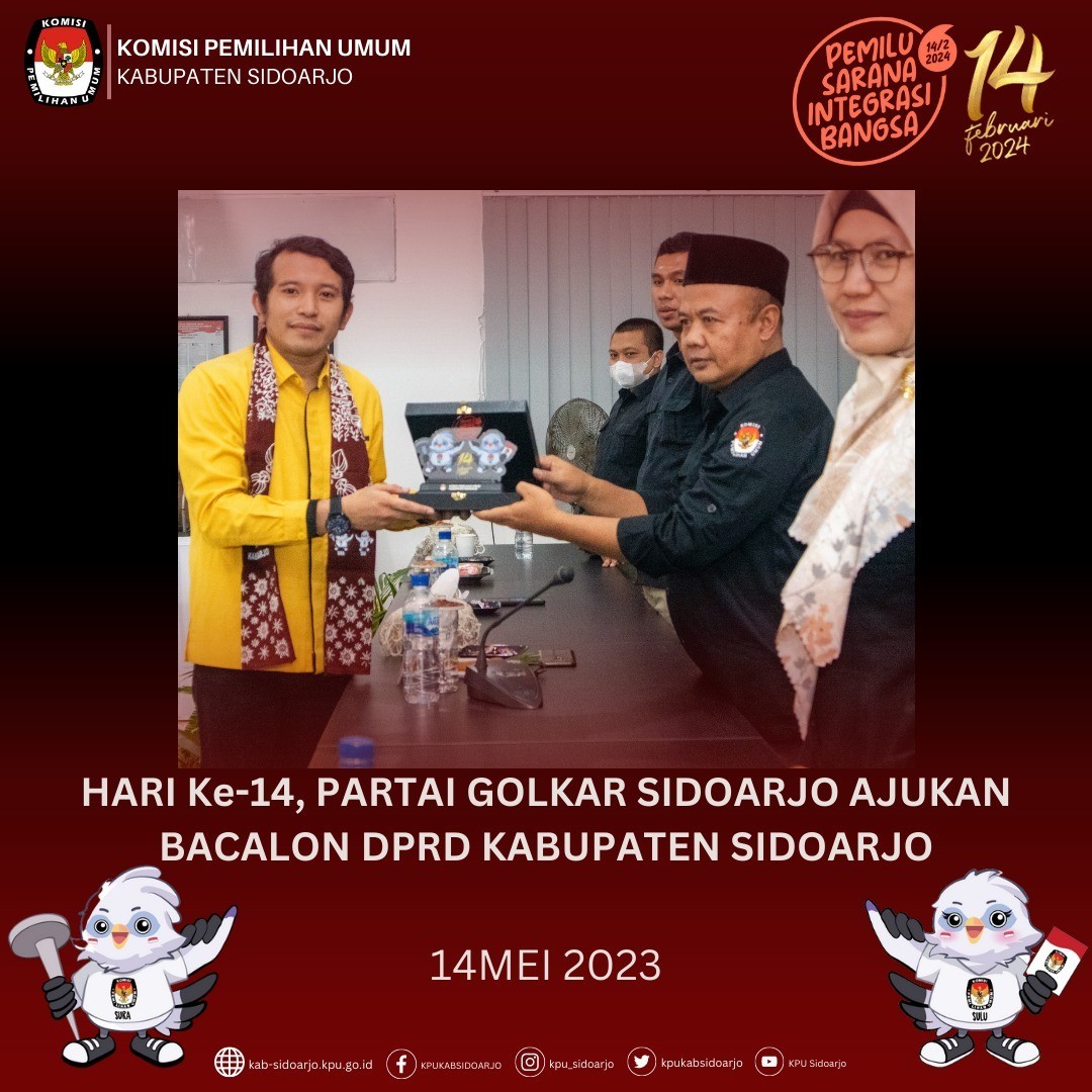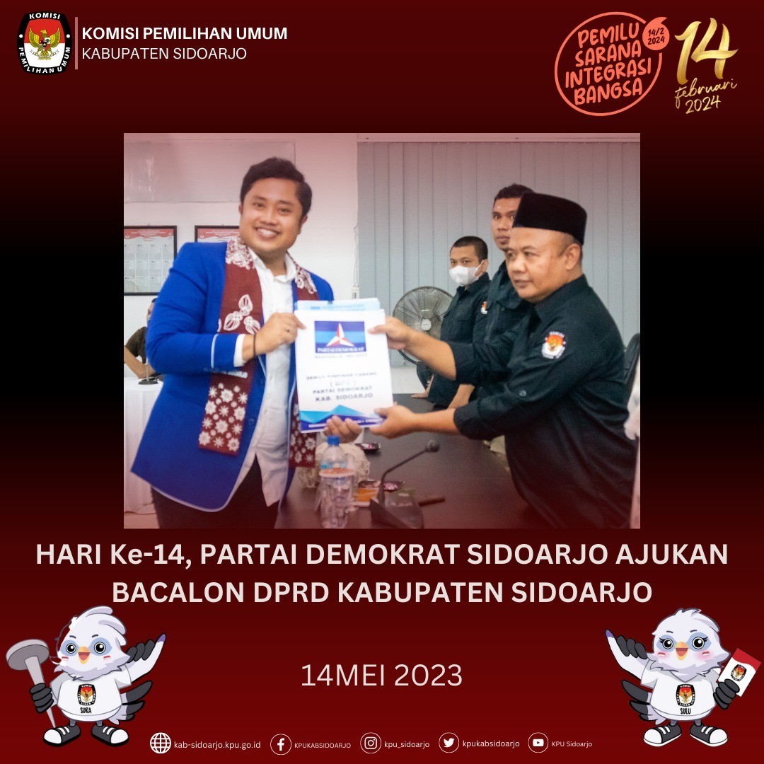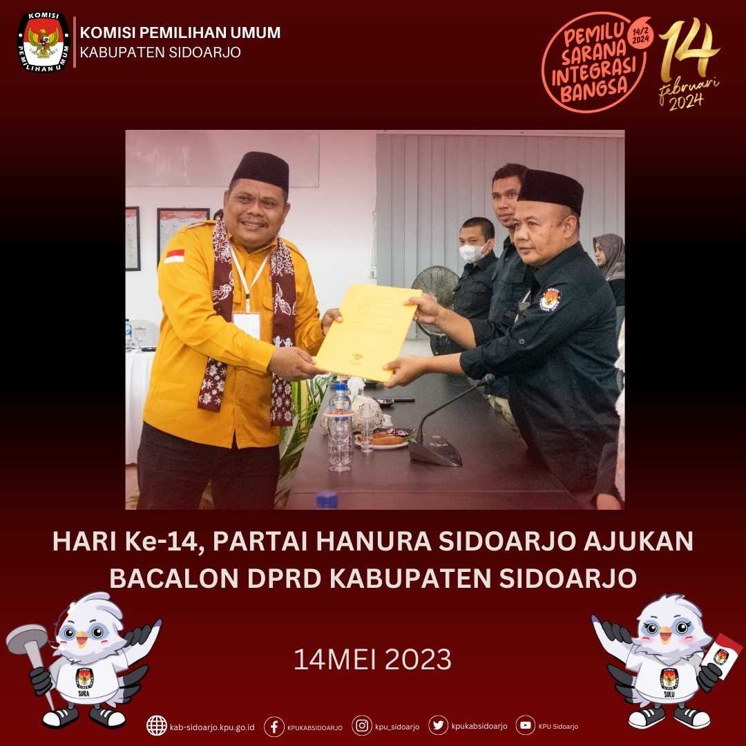 Komisi Pemilihan Umum Daerah (KPUD) Kabupaten Sidoarjo menerima pengajuan dokumen persyaratan bakal calon anggota DPRD dari Partai Solidaritas Indonesia Kabupaten Sidoarjo pada pukul 14.00 WIB, Hari Minggu (14/05).