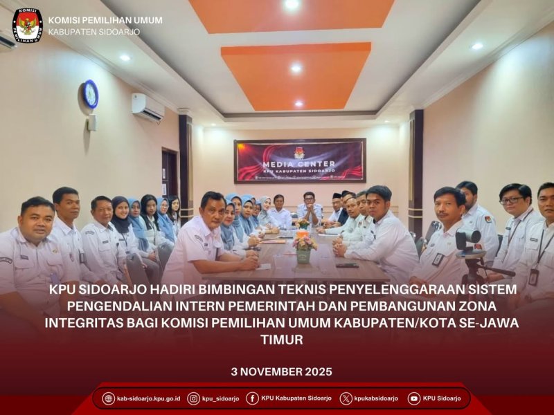 #TemanPemilih, Komisi Pemilihan Umum Kabupaten Sidoarjo (KPU Sidoarjo) mengikuti Bimbingan Teknis Penyelenggaraan Sistem Pengendalian Intern Pemerintah (SPIP) dan Pembangunan Zona Integritas (ZI) bagi KPU Kabupaten/Kota se–Jawa Timur yang diselenggarakan oleh KPU Provinsi Jawa Timur pada Senin, 3 November 2025 secara daring melalui Zoom Meeting. Kegiatan dibuka oleh Ketua KPU Provinsi Jawa Timur, Aang Kunaifi, yang menyampaikan bahwa bimtek ini diharapkan tidak hanya memperkuat pemahaman teknis penerapan SPIP, tetapi juga menanamkan nilai integritas dan akuntabilitas dalam pelaksanaan tugas kelembagaan. Ia menegaskan bahwa SPIP bukan sekadar kewajiban administratif, melainkan bagian dari upaya menjaga dan meningkatkan tata kelola yang sudah berjalan baik. Selanjutnya, Ika Putri Nilamsari, Pengendali Teknis Inspektorat KPU RI, memaparkan empat tahapan pembangunan Zona Integritas, yaitu pencanangan, penetapan, pembangunan, dan pemantauan. Ia menjelaskan bahwa unit kerja dapat diusulkan sebagai zona integritas setelah memenuhi seluruh komponen pembangunan dan menunjukkan hasil nyata dalam menciptakan lingkungan kerja bersih dari korupsi dan berorientasi pada pelayanan publik yang prima. Sementara itu, Irwan Katili dari Inspektorat KPU RI menjelaskan bahwa SPIP merupakan sistem integral untuk memastikan tercapainya tujuan organisasi melalui kegiatan yang efektif, efisien, transparan, dan sesuai peraturan. Ia menegaskan bahwa penerapan SPIP harus menjadi budaya kerja yang menjunjung integritas dan akuntabilitas di seluruh satuan kerja KPU. Hadir dalam kegiatan ini Ketua KPU Kabupaten Sidoarjo Fauzan Adim, Anggota KPU Kabupaten Sidoarjo Divisi Sosialisasi Pendidikan Pemilih, Partisipasi Masyarakat dan Sumber Daya Manusia Mokhamad Yasin, Anggota KPU Kabupaten Sidoarjo Divisi Hukum dan Pengawasan Ahmad Nidhom, Anggota KPU Kabupaten Sidoarjo Divisi Teknis Penyelenggaraan Haidar Munjid, Anggota KPU Kabupaten Sidoarjo Divisi Perencanaan, Data dan Informasi M. Natsiruddin Yahya, Sekretaris KPU Kabupaten Sidoarjo Prahastiwi Kurnia Sitorosmi, Jajaran Kasubbag dan Staf KPU Kabupaten Sidoarjo. #KPUMelayani