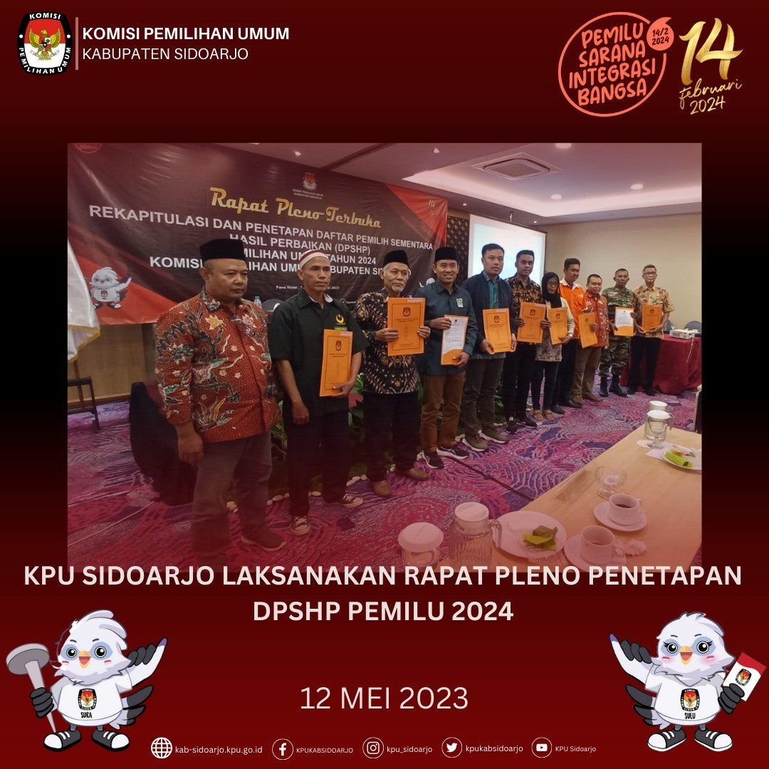 Untuk mewujudkan Penyelenggaraan Pemilihan Umum (Pemilu) tahun 2024 yang berkualitas. Komisi Pemilihan Umum (KPU) Kabupaten Sidoarjo laksanakan Rapat Pleno Terbuka Rekapitulasi dan Penetapan Daftar Pemilih Sementara Hasil Perbaikan (DPSHP) pada Pemilihan Umum tahun 2024 tingkat KPU Kabupaten Sidoarjo, di Fave Hotel Sidoarjo, Jumat (12/05/23).