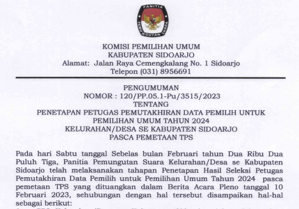 Sebanyak 5.550 Petugas Pemutakhiran Data Pemilih (Pantarlih) untuk 346 desa/kelurahan di 18 Kecamatan se-Kabupaten Sidoarjo resmi dilantik, Minggu (12/02/2023). Mukhamad Iskak, Ketua KPU Sidoarjo mengatakan, proses pelantikan Pantarlih dilakukan di masing-masing Desa atau Kelurahan oleh Panitia Pemungutan Suara (PPS). "Mereka(pantarlih) akan dilantik oleh PPS di masing-masing Desa atau Kelurahan," ujar Iskak, saat dimintai keterangan ketika monitoring di Kecamatan Buduran. Setelah proses pelantikan Pantarlih selesai akan dilanjutkan dengan apel akbar serentak Pantarlih yang akan diikuti oleh Pantarlih yang ada di Indonesia, sebelum mulainya kegiatan coklit di masing-masing desa tempat Pantarlih bertugas. "Pantarlih ini tugasnya melaksanakan pencocokan dan penelitian data pemilih serta memberikan tanda bukti terdaftar kepada pemilih," jelas Iskak. Kemudian menyampaikan hasil pencocokan dan penelitian kepada PPS, kemudian melaksanakan tugas lain yang diberikan oleh KPU, PPK, dan PPS sesuai dengan ketentuan peraturan perundang-undangan yang berlaku. Iskak berpesan agar seluruh Pantarlih yang telah dilantik agar bisa menjalankan tugas dan kewajibannya dengan baik, ia juga meminta agar pantarlih teliti terlebih tugas mereka bersentuhan langsung dengan data pemilih sehingga ketelitian sangat diperlukan. Sementara itu, Serly, salah satu petugas Pantarlih Desa Sawohan Kecamatan Buduran mengaku siap menjalankan tugas dan kewajibannya dengan baik di desa tempatnya bertugas dalam melaksanakan pencocokan dan penelitian data pemilih. "Saya siap menjalankan tugas saya dengan baik dan siap menyukseskan pemilu 2024 mendatang," ujarnya singkat.*(sym)